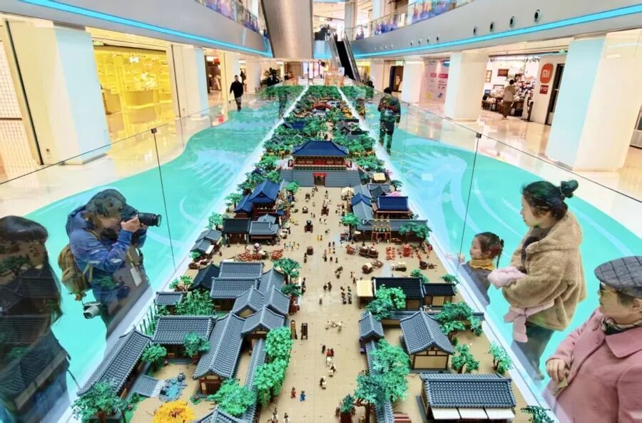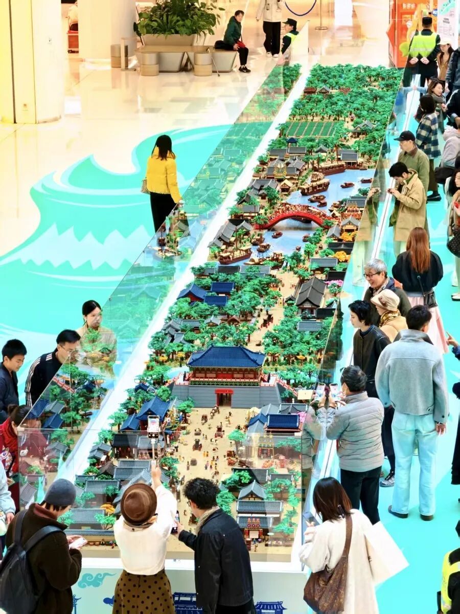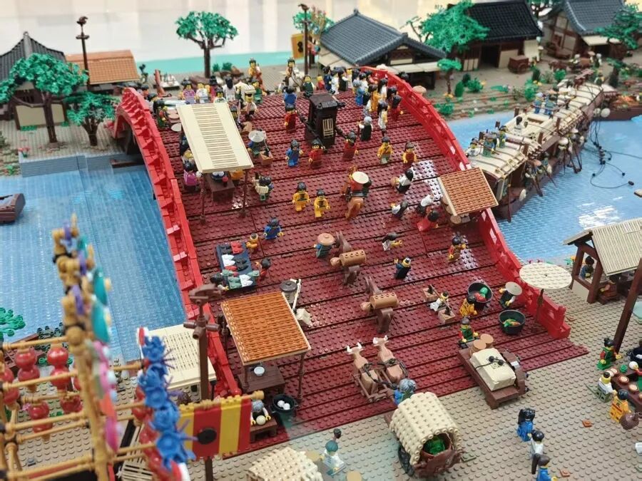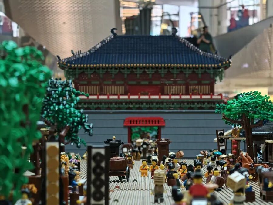“上河”之名,源自展览核心作品——由乐高专业认证大师洪子健创作、全长26.5米的乐高实景装置《清明上河图》,同时寓意南京西路作为融汇商业、人气与时尚生活方式的“河流”。这一作品于2024年创下吉尼斯世界纪录,成为当时全球最大的乐高情景模型。洪子健及其团队耗时一年,将原本平面、单色的北宋名作转化为三维立体、色彩缤纷的乐高情境模型。他表示,希望通过乐高积木呈现传统文化,让观众了解到乐高的创意所在,“积木不只是玩具,更可以再现城市文化与传统风貌。”