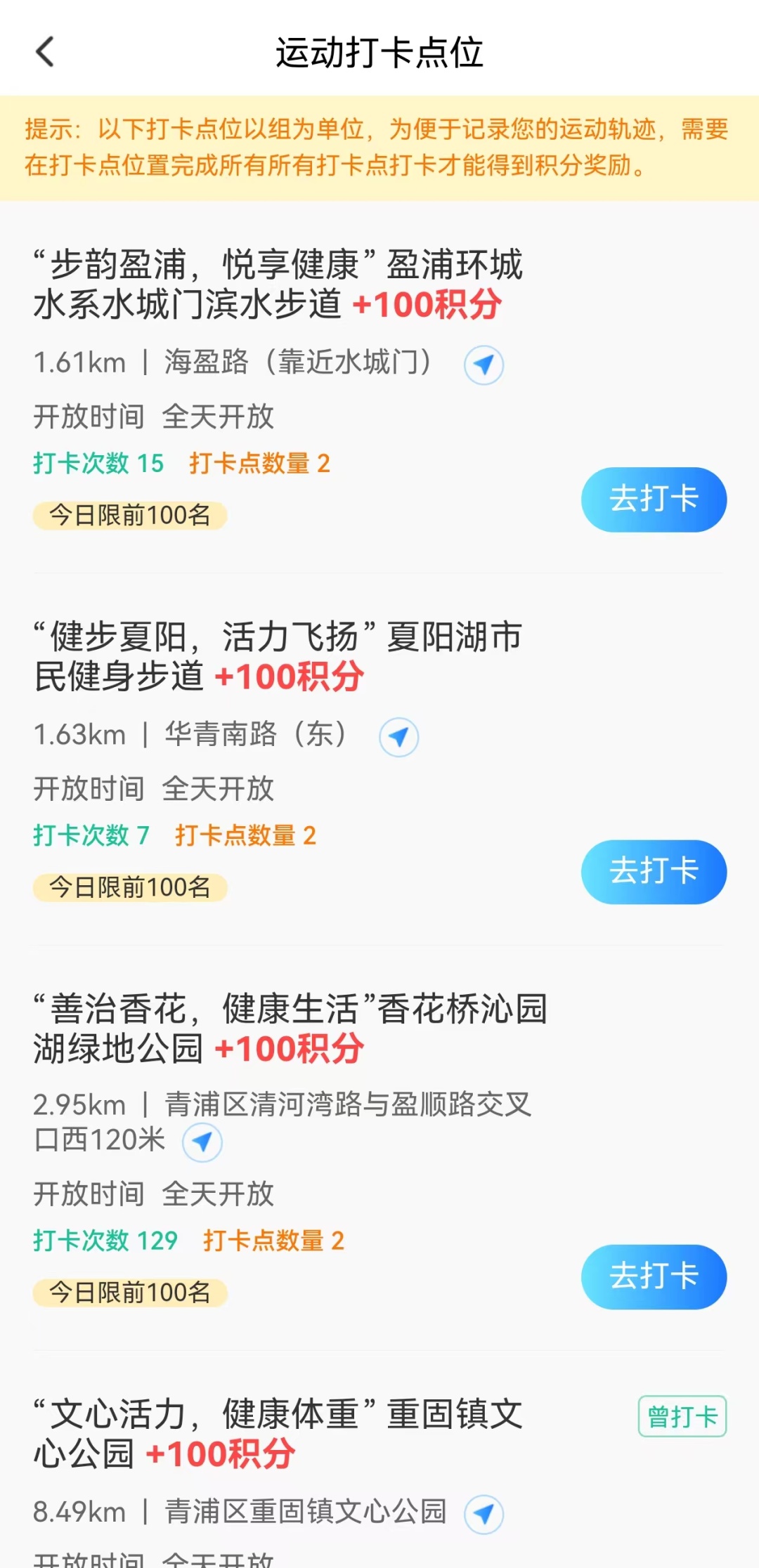 现在,青浦区健康积分制再升级!主动践行健康行为栏目的健步走打卡领积分项目,从一个公园扩展到全区多个打卡点,你的每一步,都能点亮青浦健康地图,赚取积分,兑换惊喜!