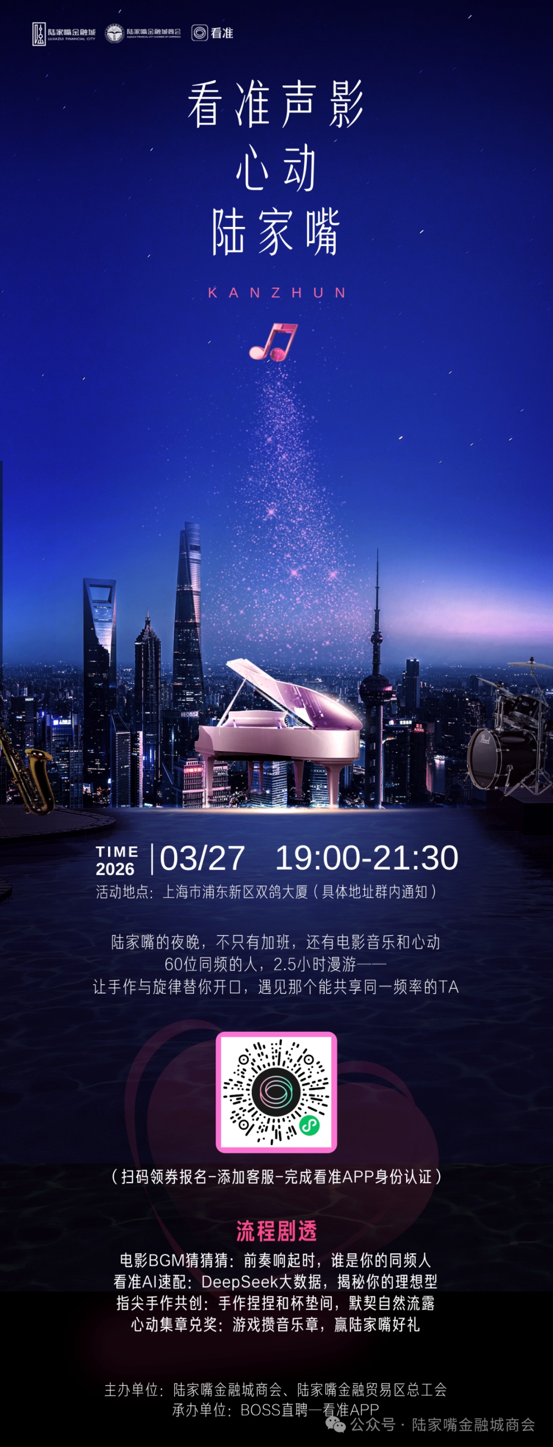★电影音乐交友派对☆ LUJIAZUI ∴○●○●●∴ 当电影BGM响起 你会不会正好看向我? ∴○●○●●∴ 3月27日晚,在陆家嘴的温柔夜色里 我们准备了一场“不尴尬、有质感”的单身相遇 电影×音乐×手作,让品味替你筛选对的人! Party Time∴○●○●●∴ ✨ 为什么值得来? • 电影破冰+AI速配:用电影联想游戏自然打开话题,AI提前帮你锁定品味相近的人 • 集章打卡+多款游戏:全程有目标不冷场,猜歌名、接台词、赢音乐章 • 手作共创+默契考验:两人一起做捏捏或杯垫,在协作中看见真实的TA 活动速览 时间:3月27日(周五)19:00-21:30 地点:双鸽大厦 人数:60-80人,陆家嘴金融城单身男女 主办:看准APP × 陆家嘴金融城商会 你会经历的环节 • 谁是桌主|电影联想破冰 • 声影穿梭|轮桌聊电影、音乐、周末 • 听前奏猜歌名|为TA赢一枚盖章 • 手作共创|捏捏/杯垫,默契大考验 • 心动表白|最受欢迎嘉宾揭晓 报名方式 扫码报名,名额有限,报满即止 这个周五夜晚 让电影BGM替你说出那句“我懂你” 长按扫码,遇见品味一样的TA ●●○