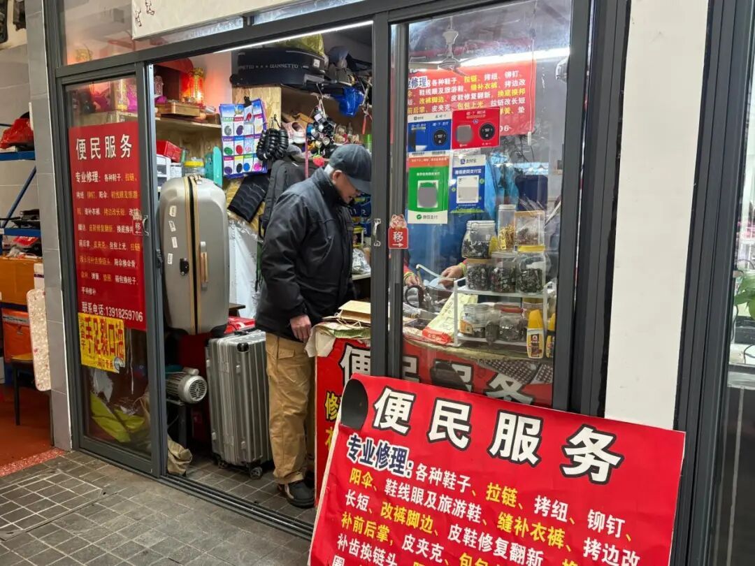 除了好吃的,中广食集还藏着上海街头如今难觅的“小修小补”店。记者看到,不时有市民带着衣服来换拉链、收裤脚,或是拿着雨伞来换伞骨。为了扶持这类便民店铺,菜场给予了租金优惠,让这些实用的便民服务能一直保留下去。
