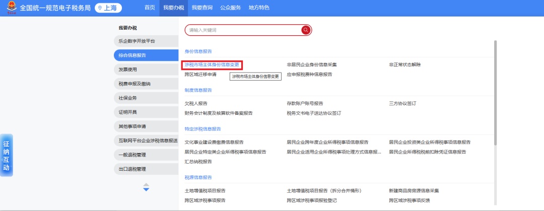 登录电子税务局后,点击【我要办税】-【综合信息报告】-【身份信息报告】-选择【涉税市场主体身份信息变更】。