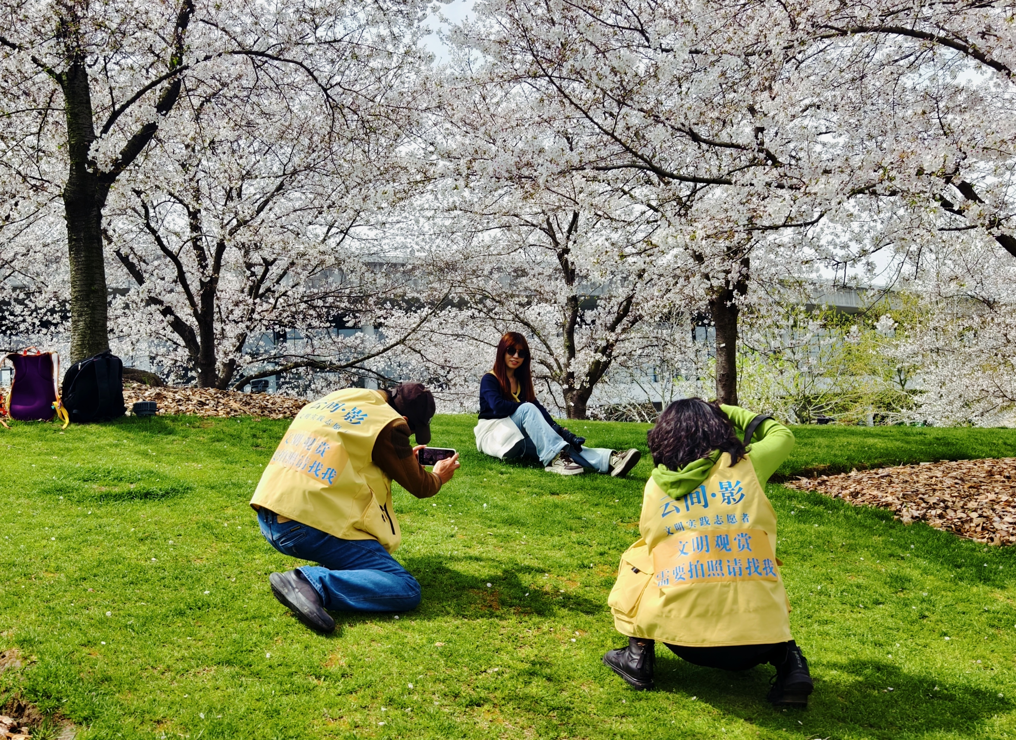 “三月樱花盛开,每年我们都会约着来拍的。但是近几年商拍泛滥,爬树、摘花等不文明行为也时有发生。不仅影响赏花体验,摄影的质量与体验也很难得到保障。”俞凤利直言,有感于此,他们特地报名参与本次文明摄影志愿服务,希望能为文明赏樱尽一份力。
