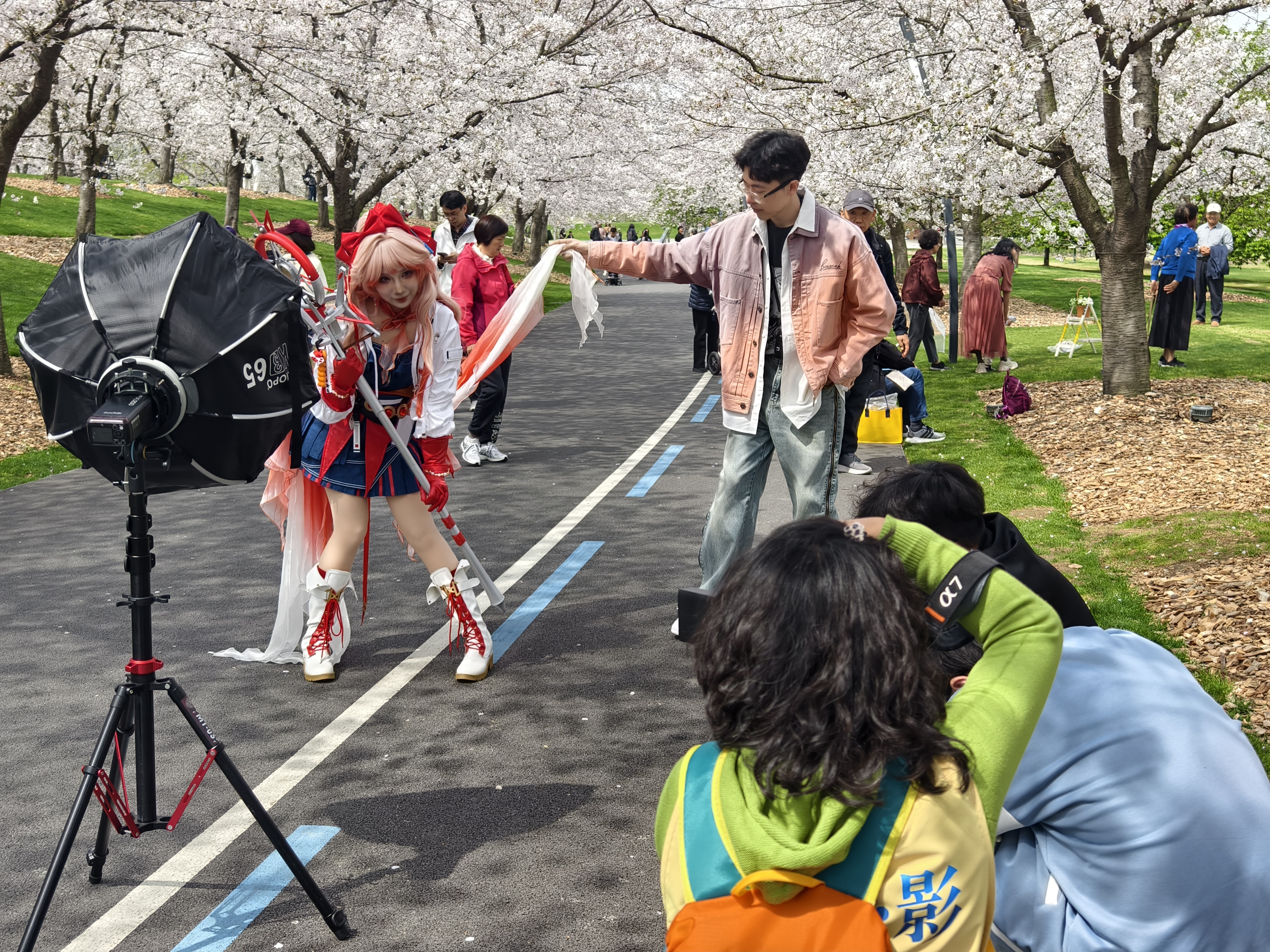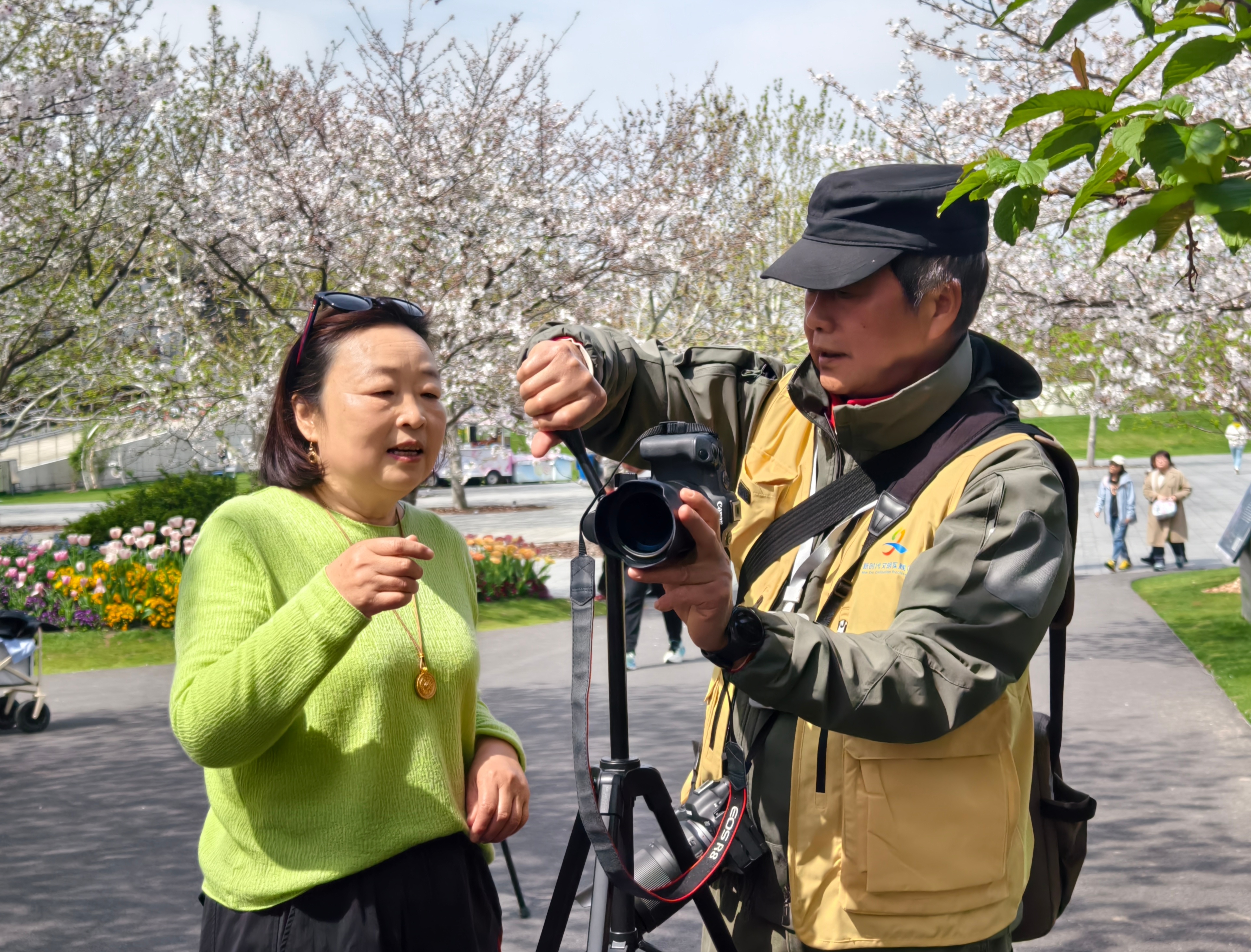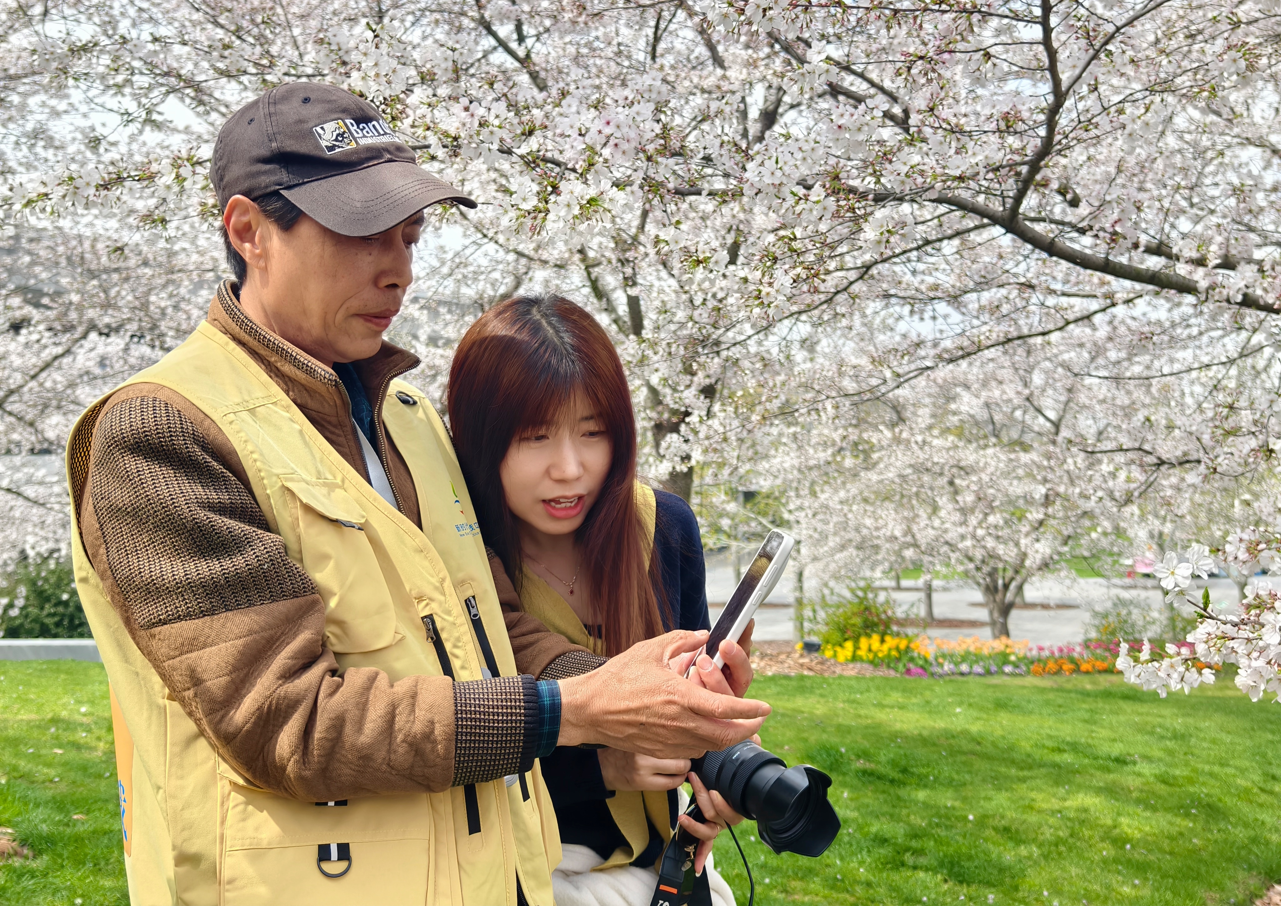 这支特别的志愿者队伍由松江区精神文明办、松江区摄影家协会联合组建,成员均具备专业摄影功底,并全部完成岗前服务规范、文明引导、应急处置等专项培训,摄影爱好者俞凤利便是其中一员。在现场,除了帮市民游客免费“出片”,俞凤利和伙伴们游走在樱花大道、樱花车站、樱花小火车等核心打卡点,主动告知游客最佳拍摄机位与光影时段,引导自带设备游客有序拍摄,并积极劝导商拍团队移步至樱花坡等开阔区域拍摄,疏解主干道拥堵压力。