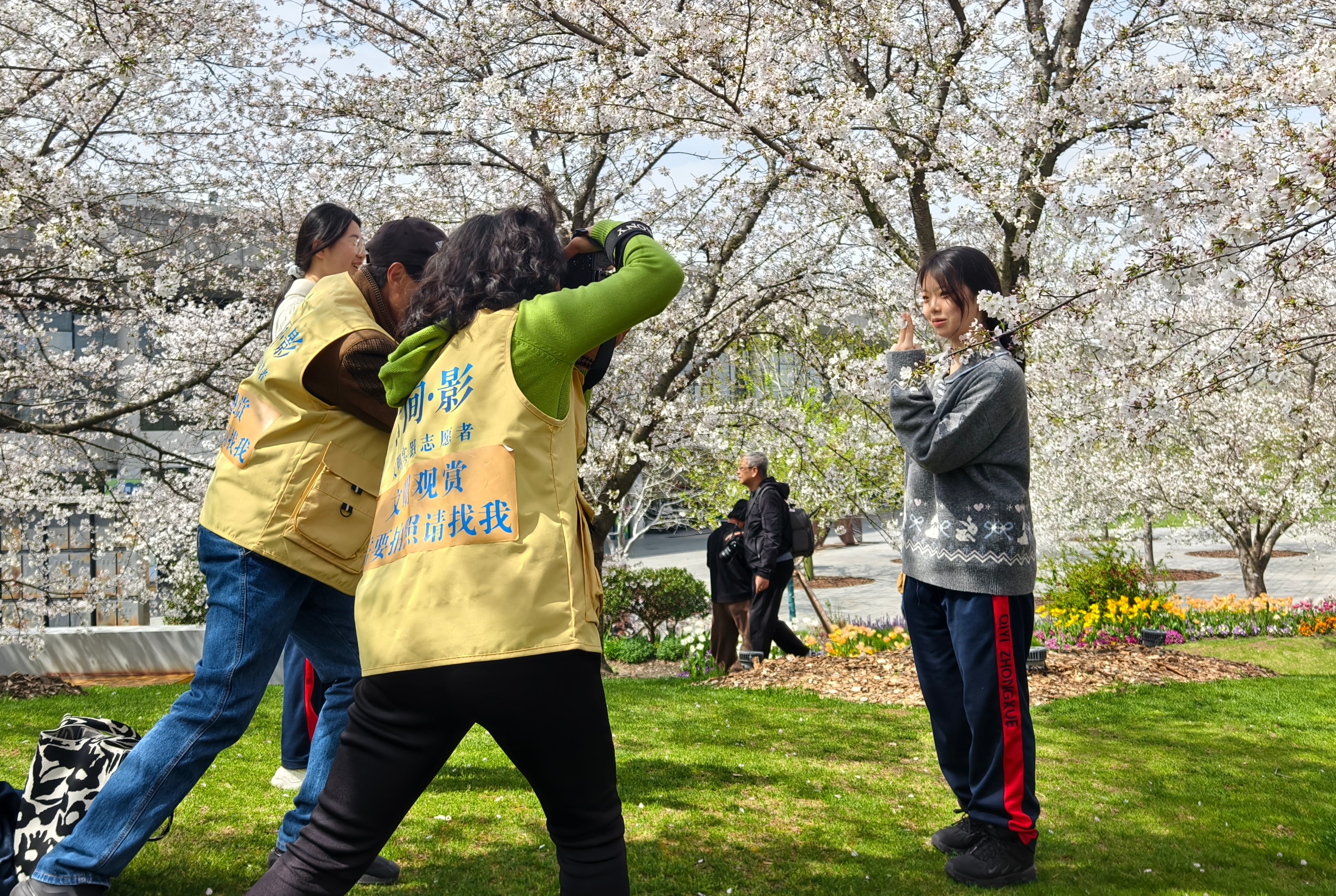 此前,辰山植物园河津樱大道、樱花渡口因出片效果出众,成为网红打卡与商业拍摄集中点位,长梯、布景道具等不仅挤占通行空间,还影响普通游客游览体验。眼下,园内中樱进入盛放期,游客拍照打卡需求持续高涨,辰山植物园主动联动松江区精神文明建设办公室、上海市公安局松江分局、松江区文旅局等多部门,构建统筹协调、现场联动、信息共享、宣传引导四位一体的综合治理机制,提前制定大客流疏导预案、文明游园倡议及商拍规范指引,并创新推出了本次“樱花记辰者”志愿服务行动,以温情服务回应市民“打卡热情”,为春日赏樱增添一抹文明亮色。