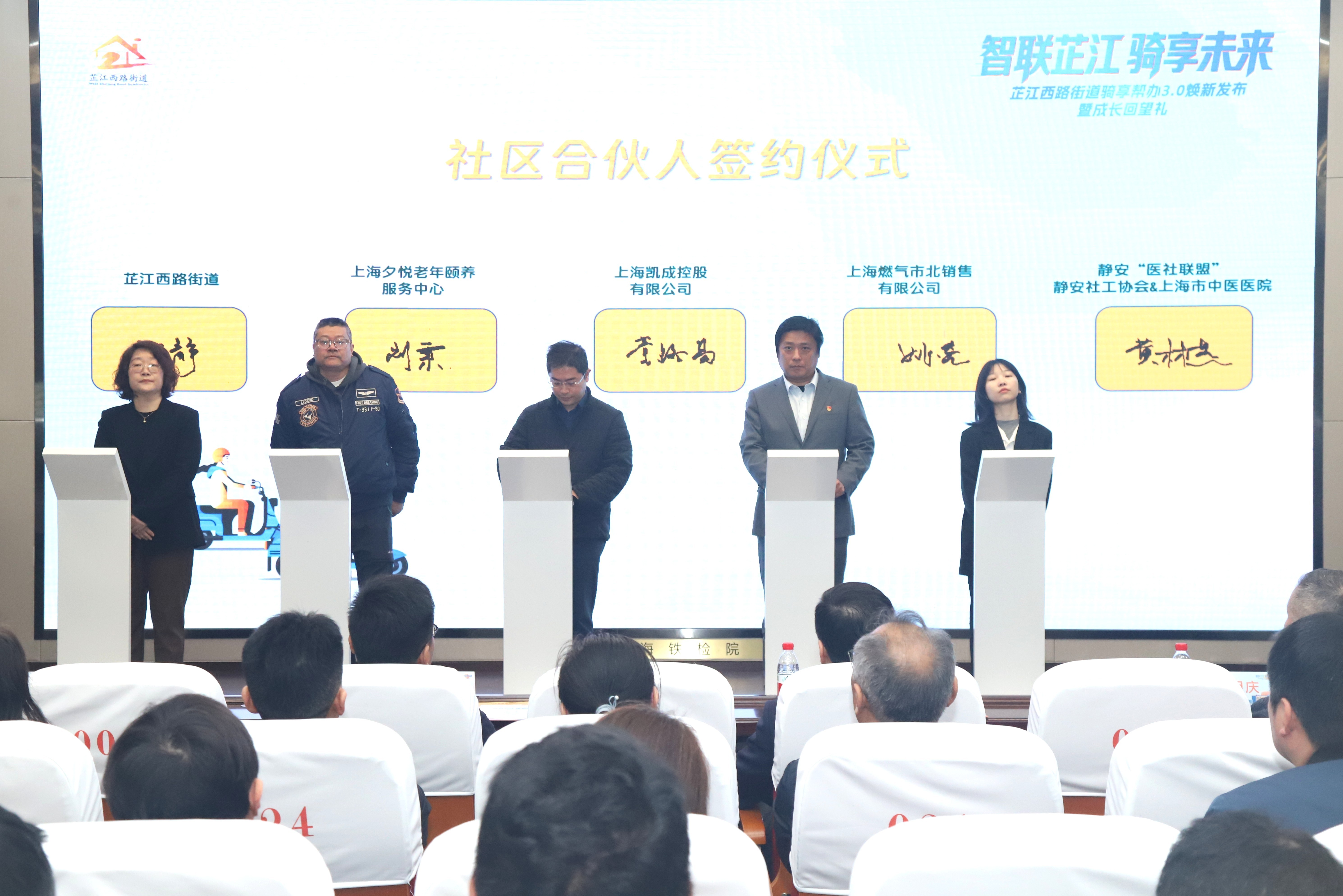 为进一步拓展服务资源、延伸服务触角,现场举行了社区合伙人签约仪式,上海凯成控股有限公司、上海君赛律师事务所、上海市闸北公证处、中国工商银行共和新路支行、上海燃气市北销售有限公司、静安“医社联盟”等9家单位正式成为骑享帮办社区合伙人,覆盖法律服务、医疗健康、公证服务、金融保障、燃气安全、养老服务等多个领域。