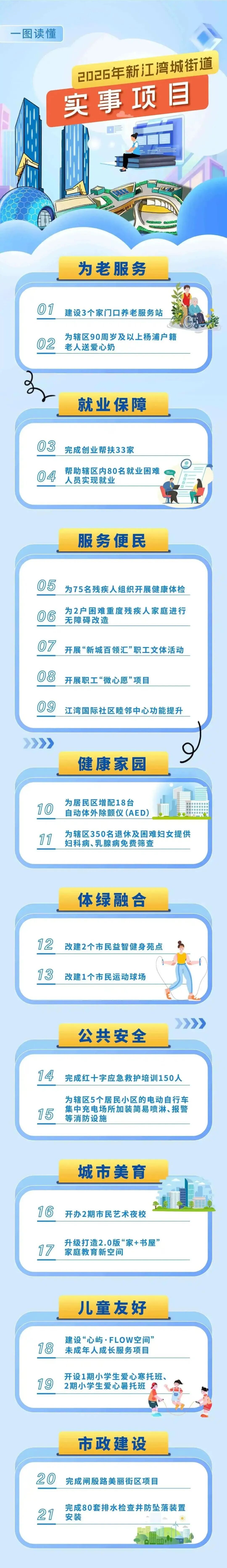 全龄友好添活力。 聚焦“一老一小”及青年群体,今年街道将改建2个市民益智健身苑点、1个市民运动球场,推出“新城百领汇”职工文体活动及职工“微心愿”项目,开办2期市民艺术夜校,丰富企业职工文化生活。开设1期小学生爱心寒托班、2期爱心暑托班,升级打造2.0版“家+书屋”家庭教育新空间,建设“心屿·FLOW空间”未成年人成长服务项目,构建覆盖全生命周期的服务矩阵。