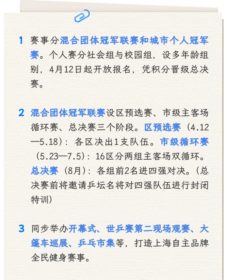 赛事之外,乒乓球嘉年华一场场配套活动也将在申城展开,形成“乒乓搭台、宣传造势、文商旅展唱戏”的创新融合场景,激发全民狂欢。