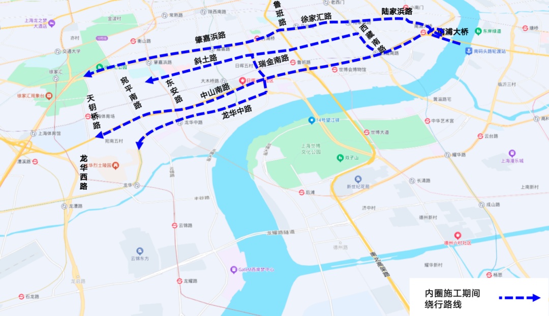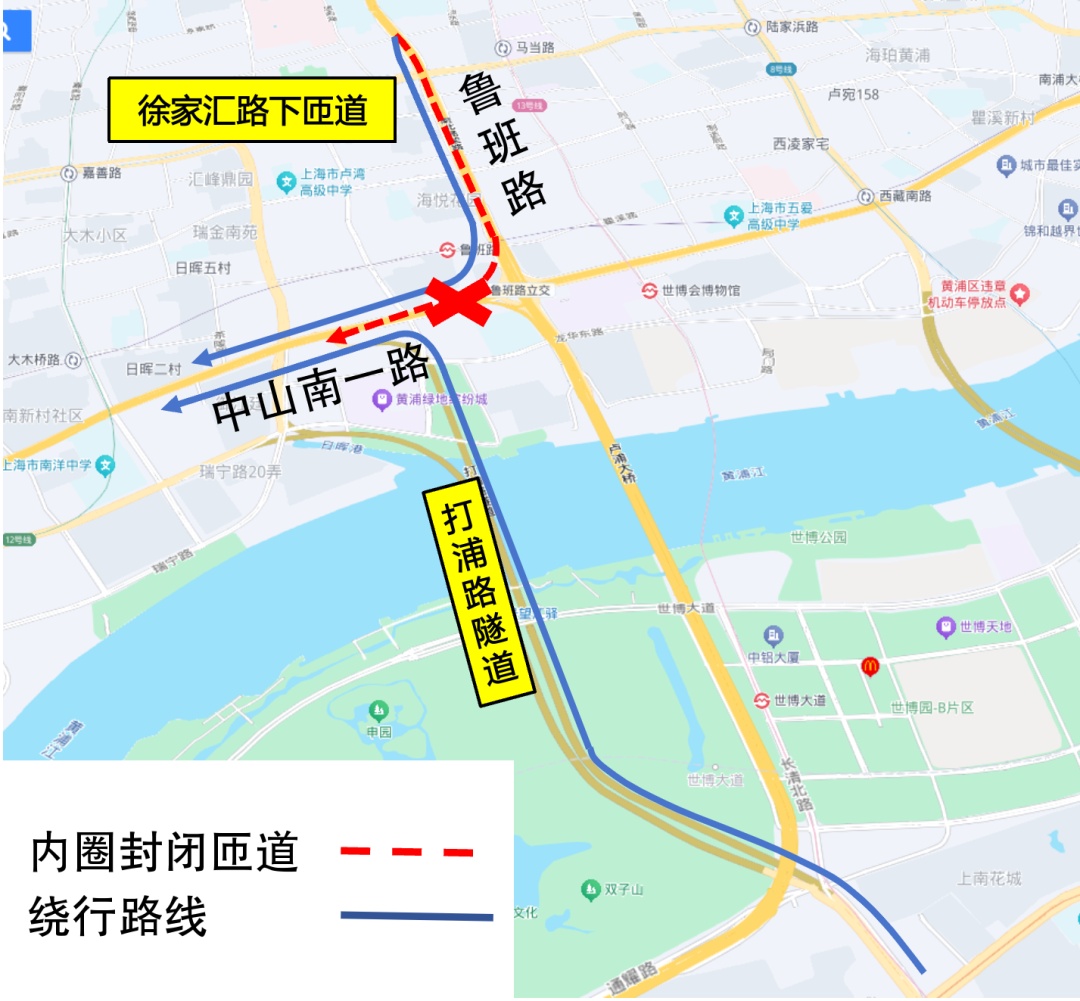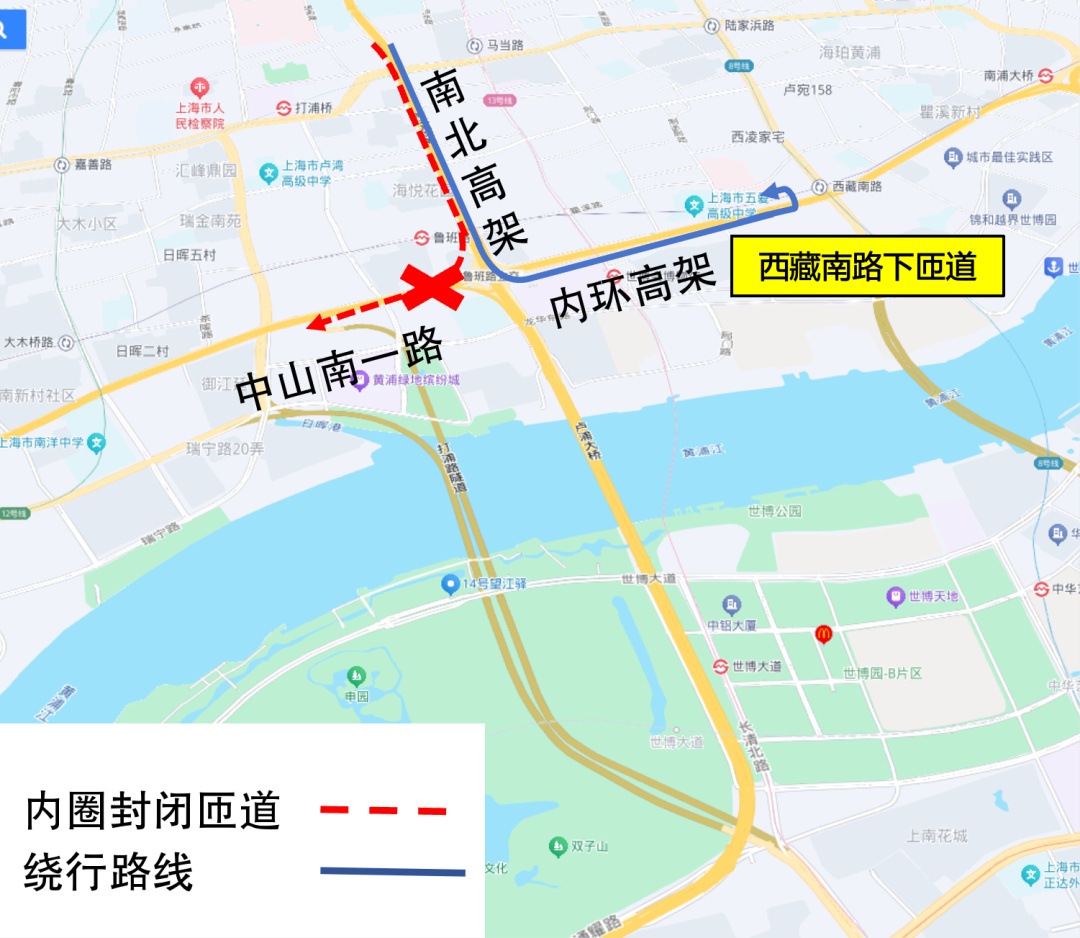 鲁班转盘往内环高架内圈匝道封闭期间,原途经车辆需往外圈西藏南路下匝道驶离高架,掉头后沿中山南一路继续行驶,或提前经南北高架西侧徐家汇路、打浦路隧道等周边道路绕行。