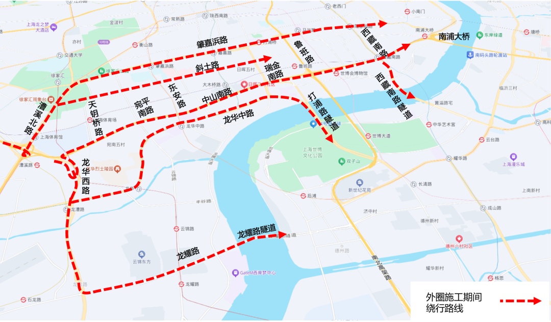 计划4月7日进行施工准备,4月8日起进行桥面系铺装、伸缩缝更换等作业,预计5月31日完成龙华西路至南浦大桥所有施工内容。施工期间,相关交通组织调整如下: