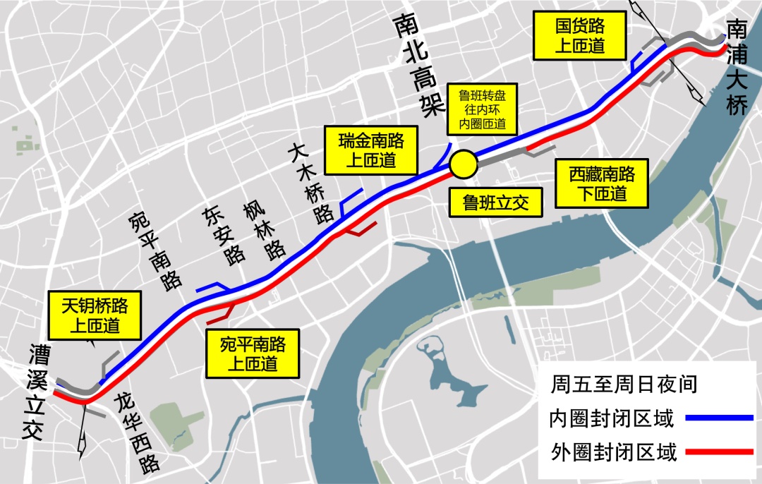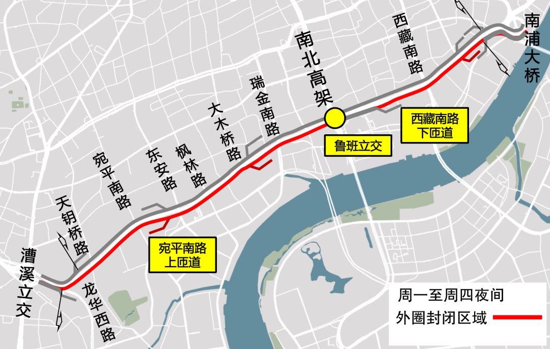 4月8日至5月5日周一至周四夜间24时至次日晨6时内环高架(南浦大桥至龙华西路)外圈主线封闭;周五、六、日夜间24时至次日晨6时内环高架(南浦大桥至龙华西路)双向主线封闭,鲁班转盘往内环内圈匝道封闭。