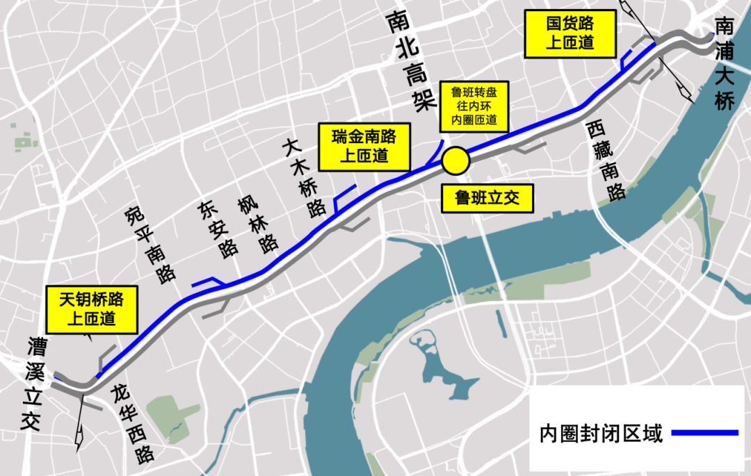 5月6日至5月31日周一至周日夜间24时至次日晨6时内环高架(南浦大桥至龙华西路)内圈主线封闭,鲁班转盘往内环内圈匝道封闭。