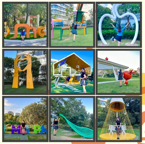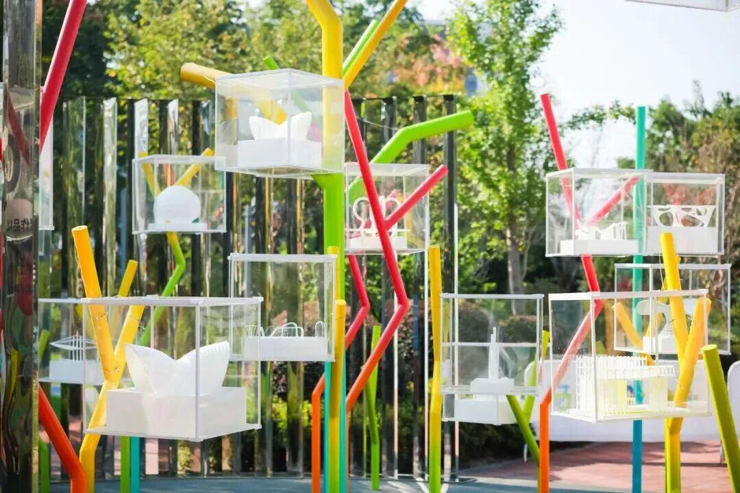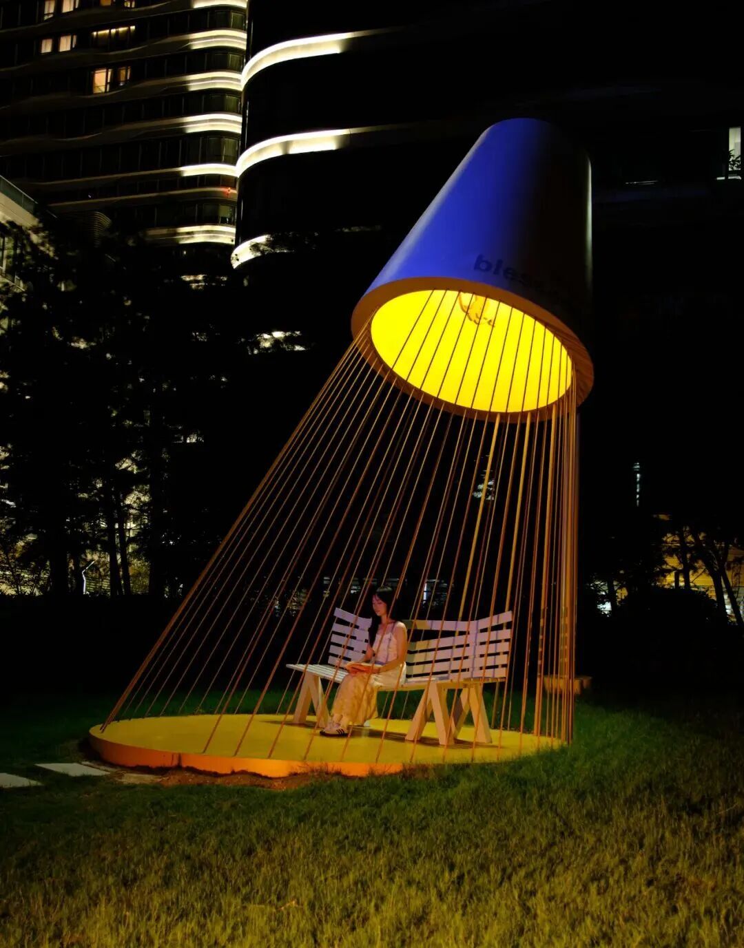 超大的台灯造型座椅、浪漫的双人秋千、尖顶的奶油黄房子……造型百变的城市家具加上花开惊艳的城市景观,犹如来到绿野仙踪般的童话世界。