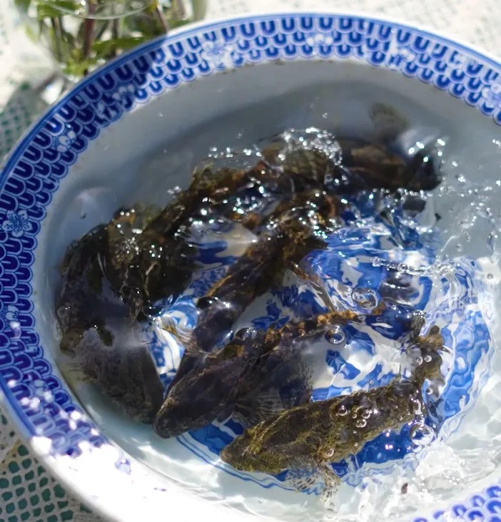 最简单最经济的办法是用手指钓。这可不是天方夜谭。江南水乡,屋前宅后到处都是洗刷用的水桥。它用石板筑就,底部有空隙,塘鳢鱼最喜在此栖身觅食产卵。少儿白白嫩嫩的小手指,沿着石缝轻轻地抚摸过去,它或许以为是美食送上门,或许以为是有不速之客来侵犯它的领地,它会冷不防咬将上来。此时,你只要迅速捏拢五指,一条圆滚滚的塘鳢鱼就在你手里提上来了。