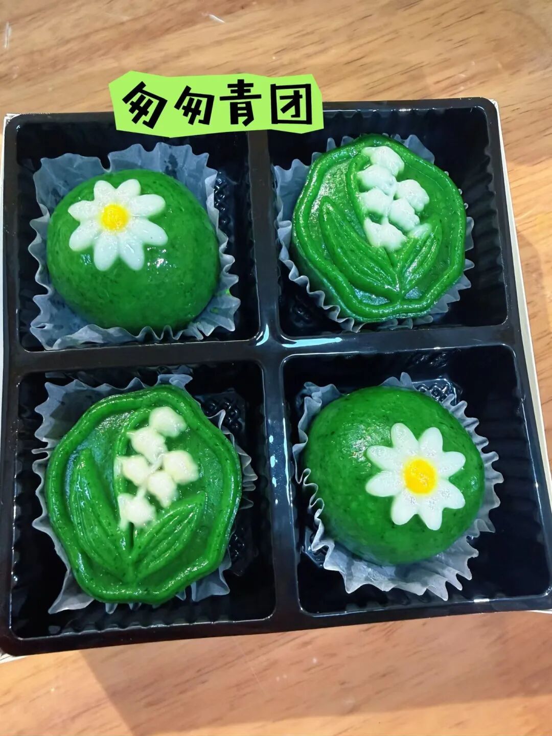 最费功夫的是压花纹——姚蓓贤拿起一把特制的模具,对准青团表面轻轻一按,再小心翼翼地提起,一朵小花便嵌在了碧绿的团子上。