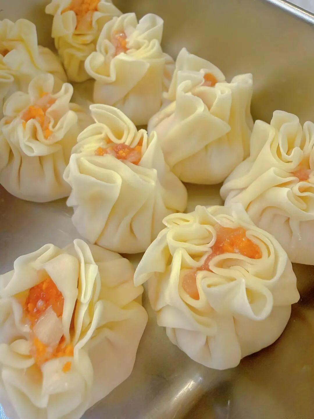旁边的绿色包子用菠菜汁和面,油亮饱满;笋丁烧麦透着隐约的鲜,掰开来,实实在在的笋丁拌着肉馅,还加了海胆提鲜。这些时令点心,全是姚蓓贤自己琢磨的,外面见不着。