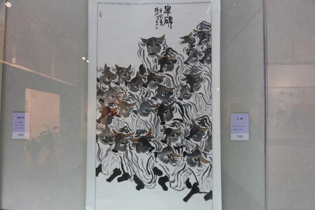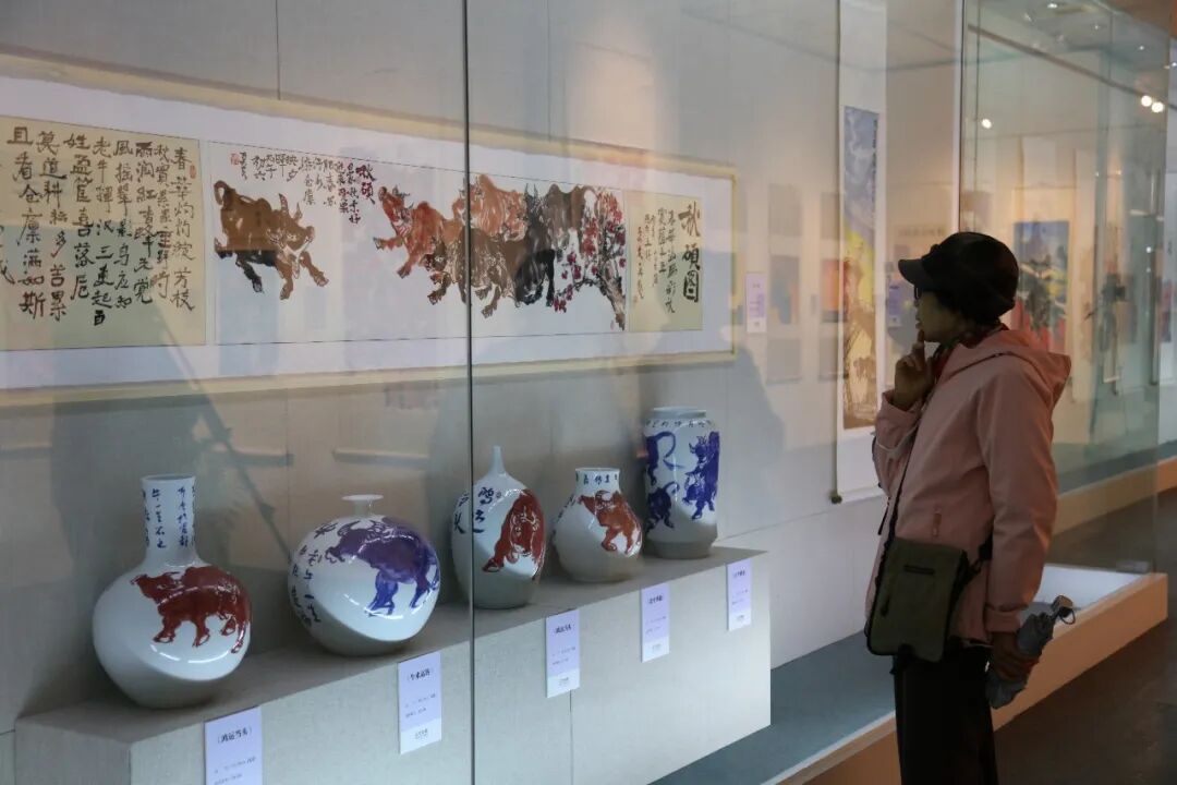 展览现场,5件绘有牛纹样的瓷艺作品引人注目。秦胜水介绍,他在景德镇创作多年,尝试将牛的精神载于器上,“瓷上作画难度更大,经过窑变会产生意想不到的效果,但无论用什么载体,核心都是‘以牛育人’。”