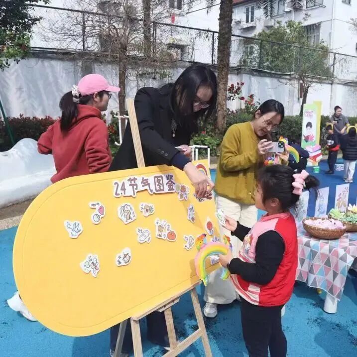 如果说共读环节是静心聆听,那接下来的“游园集章乐·趣闯节气关”互动体验区,则彻底点燃了孩子们的参与热情。六大特色关卡一字排开,每个孩子手里紧紧攥着一张集章卡,像小小探险家一样开启了自己的“节气闯关之旅”。