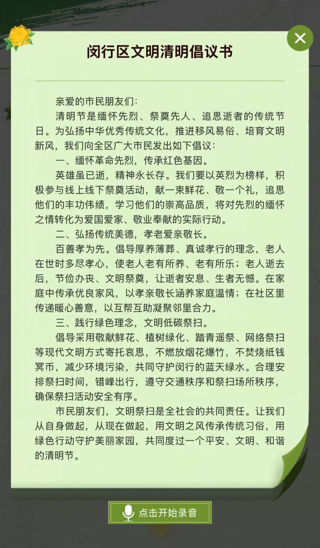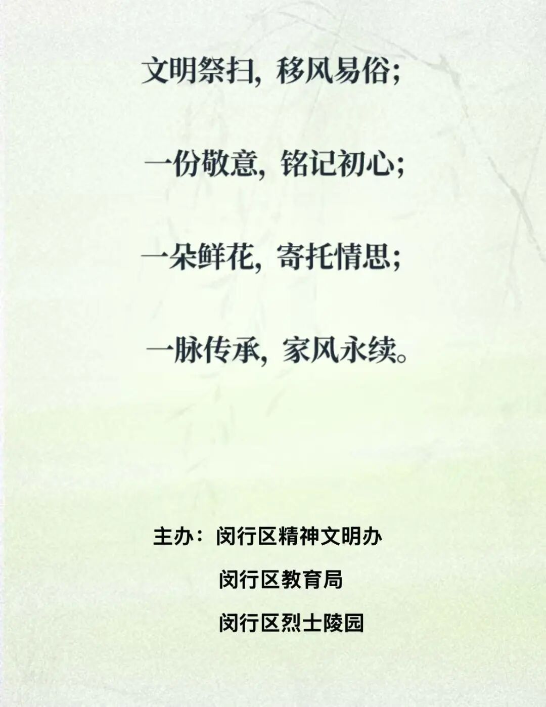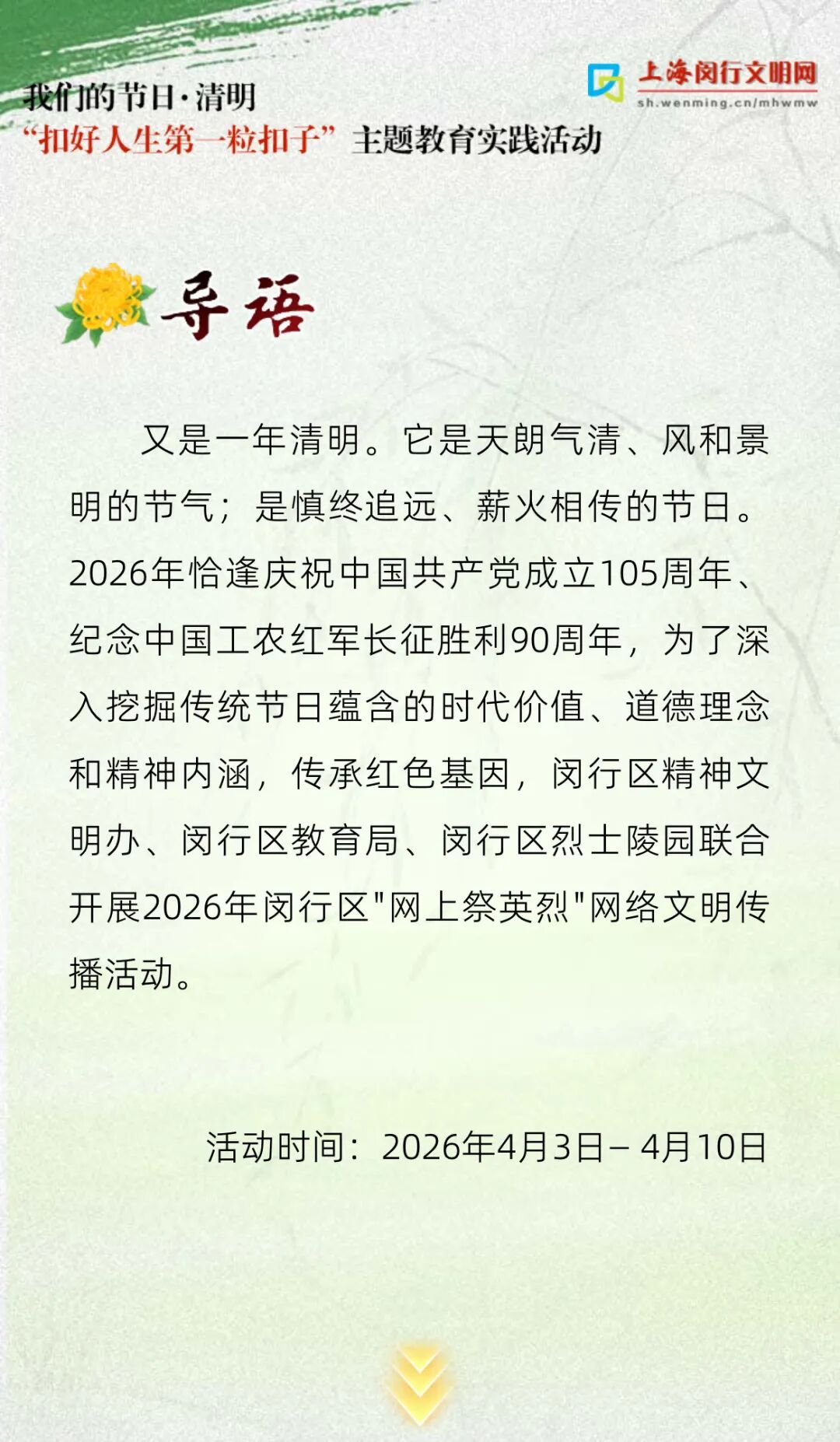 2026年恰逢庆祝中国共产党成立105周年、纪念中国工农红军长征胜利90周年,为了深入挖掘传统节日蕴含的时代价值、道德理念和精神内涵,传承红色基因,闵行区精神文明办、闵行区教育局、闵行区烈士陵园联合开展2026年闵行区“网上祭英烈”网络文明传播活动。