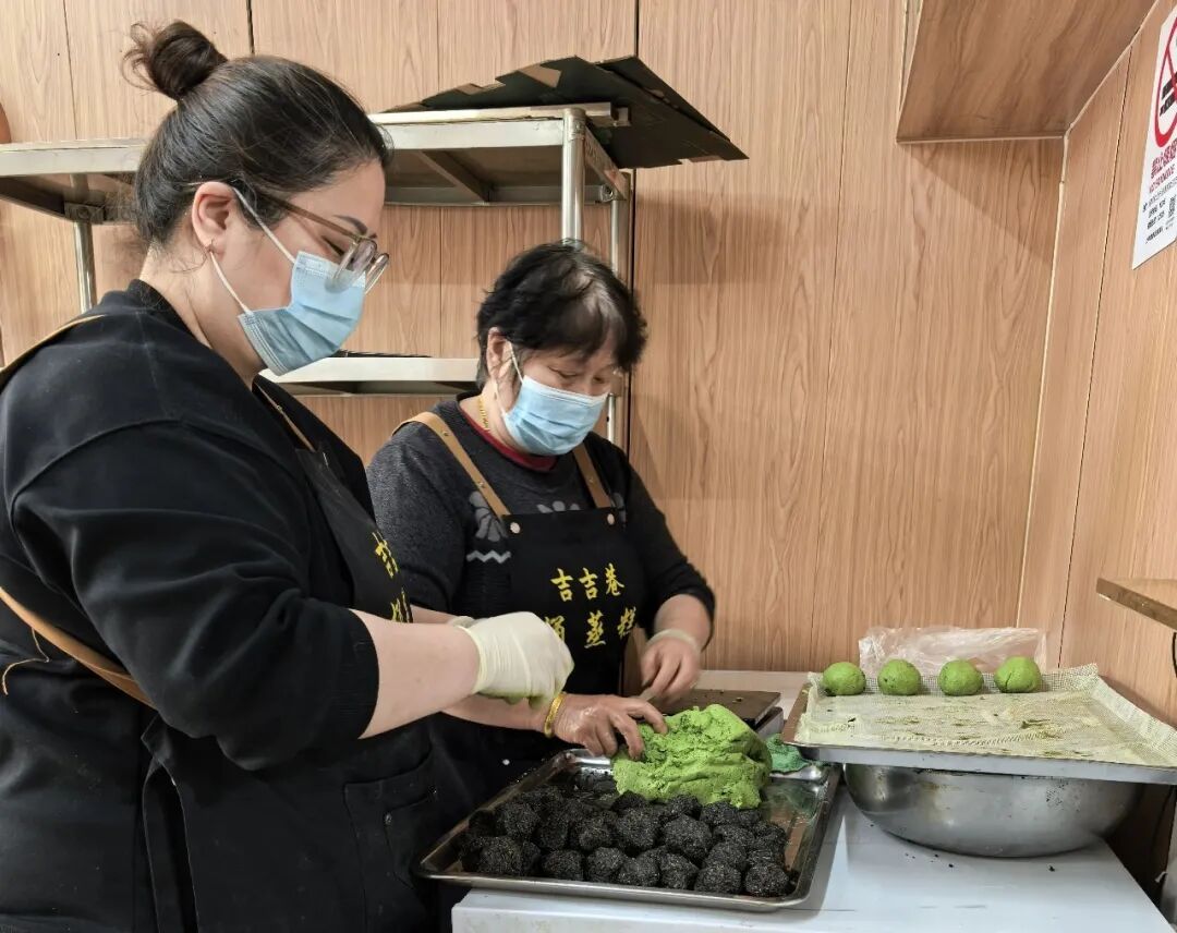 走进北松公路的吉吉巷桶蒸糕,一块写着“梅干菜笋丁肉糜”青团的小黑板格外显眼,这是店主沈静今年推出的青团新品。不同于常见的艾草青团,她用的是老一辈传下来的原料——泥胡菜,裹着梅干菜肉糜的咸香与笋丁的脆嫩,口感清新醇厚。 作为颛桥桶蒸糕制作技艺主要传承人,沈静是土生土长的北桥人。11年前,30岁出头的她还是一名收入稳定的公司白领,但为了复刻童年的糕味,她辞职接过外婆和妈妈手中的糕桶,让桶蒸糕这门延续百年的非遗技艺在烟火气中焕发新生,也让青团这样的农家风味美食有了新的口味。