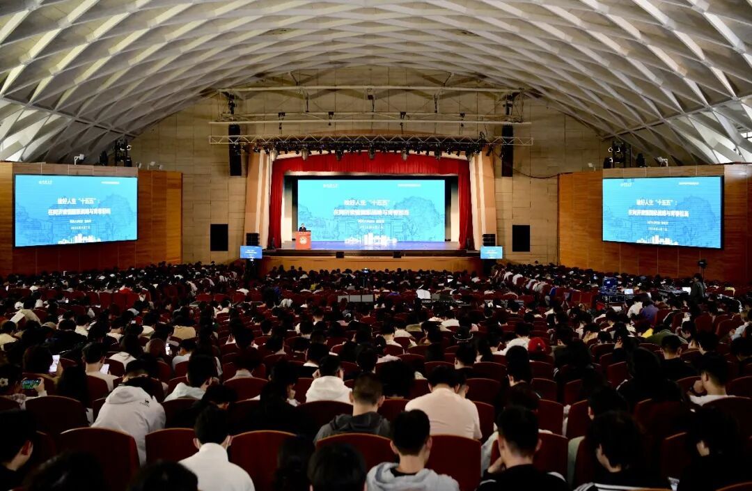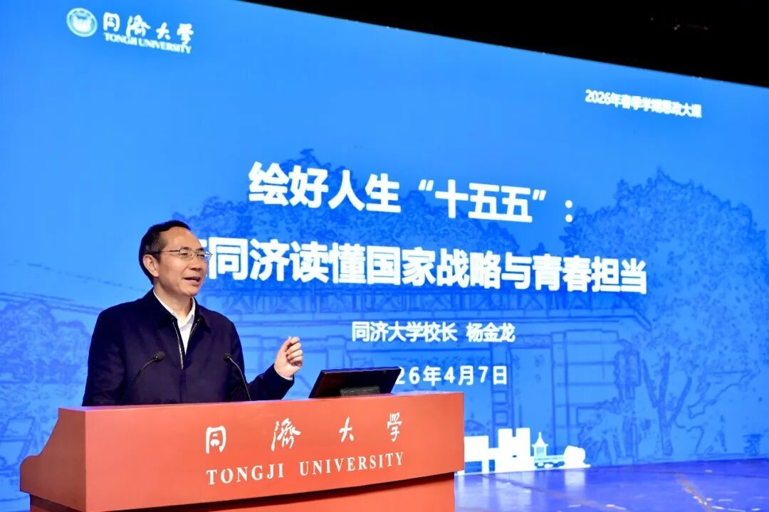 今天(4月7日)下午,同济大学2026年春季学期思政大课在四平路校区大礼堂内开讲,同济大学校长、中国科学院院士杨金龙以《绘好人生“十五五”:在同济读懂国家战略与青春担当》为题,为大一学子解读国家“十五五”规划纲要,勉励同学们将自身成长与国家发展紧密结合,深耕学业,练就过硬专业本领,在中国式现代化建设中挺膺担当、贡献青春力量。