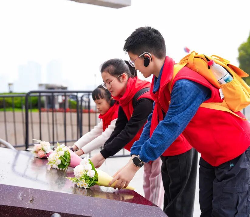 一路行走,一路感悟;一路追思,一路传承。经过近2.5km的沿途寻访,队伍抵达位于黄浦公园的人民英雄纪念塔下。黄浦区小小红色宣讲员、格致中学学生代表、市民分别手持鲜花,整齐列队,在纪念塔前肃立默哀,向为上海解放和革命事业英勇献身的英烈们深深鞠躬、致敬献花,表达对英烈的深切缅怀与崇高敬意。