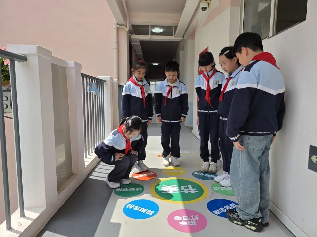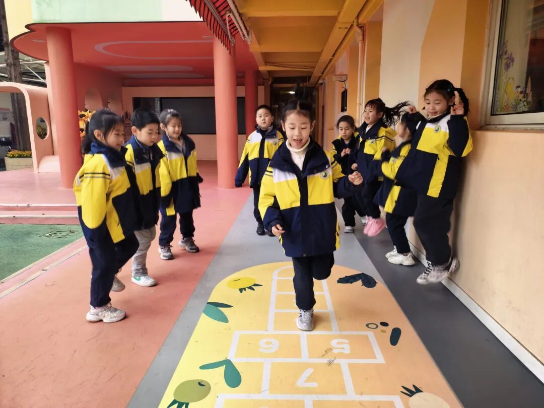学校还根据教学楼五层不同的功能定位,每层都设计了专属主题的跳房子游戏:二楼的跳房子格子结合二十四节气,让传统文化跃然脚下;三楼的跳房子融入人工智能小知识,在跳跃中解锁新内容;四楼的跳房子则结合艺术元素,边玩边浸润美育熏陶;五楼把行为规范融入跳房子,让行规教育在快乐跳跃中入脑入心,让孩子们真正在“玩中学、学中乐”。