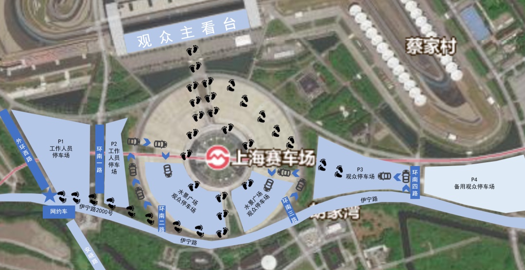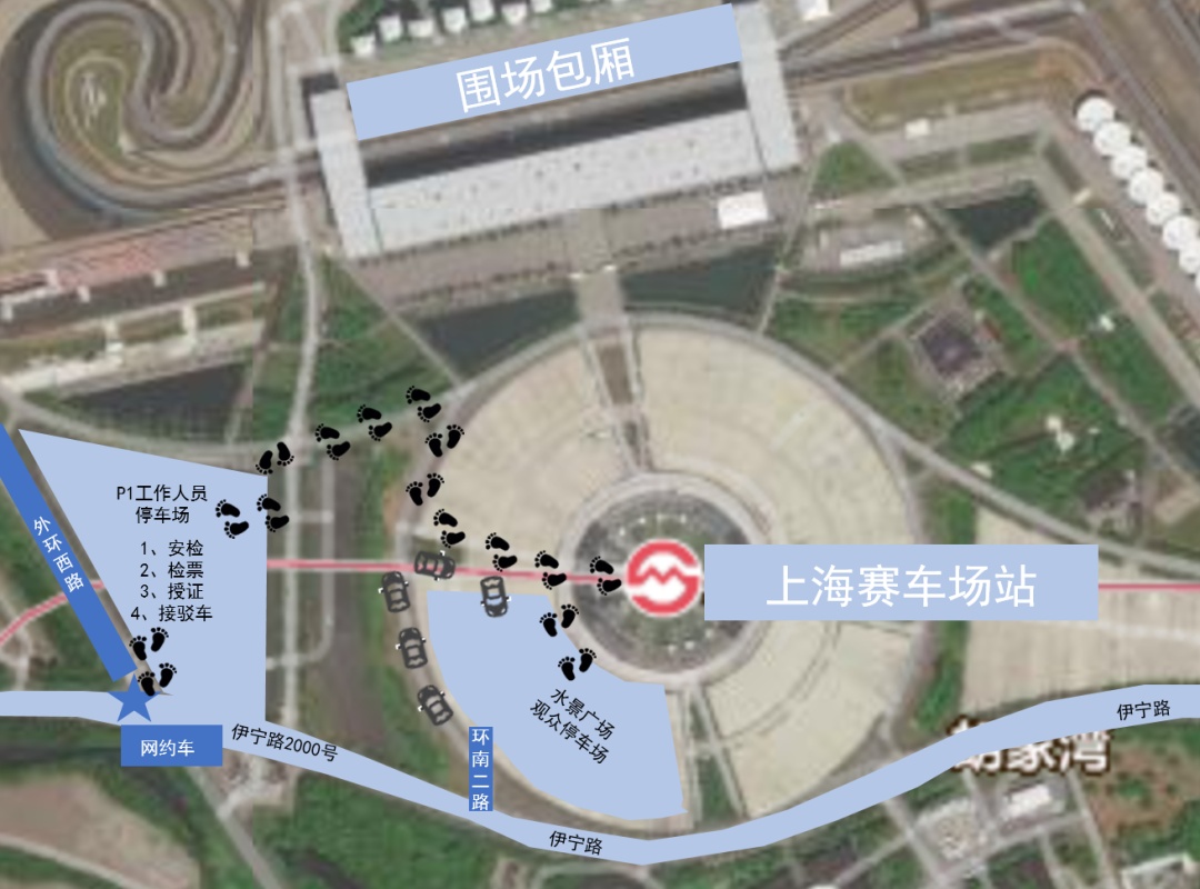 01 地铁出行 怎么出行最方便? 公共交通! 轨交11号线上海赛车场站直达最方便! 地铁11号线为Y字形路线,观赛观众须乘坐前往花桥方向的地铁! 02 当天地铁往返路程 1.上海虹桥国际机场/上海虹桥火车站地铁站到上海国际赛车场地铁站,往返线路涉及2号线和11号线(花桥方向),在江苏路地铁站完成换乘,通行时间约为1小时10分钟。赛事结束后,请计算好从主看台到地铁的步行和排队时间,留足充足时间,以免耽误您的返程行程。 2.上海浦东国际机场地铁站到上海国际赛车场地铁站,往返路线涉及2号线和11号线(花桥方向),在江苏路地铁站完成换乘,通行时间约为2小时。赛事结束后,请计算好从主看台到地铁的步行和排队时间,留足充足时间,以免耽误您的返程行程。 3.上海火车站地铁站到上海国际赛车场地铁站,往返线路涉及4号线和11号线(花桥方向),在曹杨路地铁站完成换乘,通行时间约为50分钟。赛事结束后,请计算好从主看台到地铁的步行和排队时间,留足充足时间,以免耽误您的返程行程。 4.上海南站地铁站到上海国际赛车场地铁站,往返路线涉及15号线和11号线(花桥方向),在上海西站地铁站完成换乘,通行时间约为1小时10分钟。赛事结束后,请计算好从主看台到地铁的步行和排队时间,留足充足时间,以免耽误您的返程行程。 5.上海西站地铁站到上海国际赛车场地铁站,往返路线涉及11号线(花桥方向),通行时间约为30分钟。赛事结束后,请计算好从主看台到地铁的步行和排队时间,留足充足时间,以免耽误您的返程行程。 03 自驾 上海国际赛车场面向观众开放公共停车场,请自驾的观众尽快在“久事体育”APP完善车牌信息,操作方式详见图片。 1 内场工作人员停车场 ① P1:围场包厢观众检票点,内场工作人员停车场(导航到伊宁路2000号) ② P2:内场工作人员停车场(导航到伊宁路2000号) 2 观众停车场: ① 西水景广场观众停车场:看台观众停车场(导航到伊宁路环南二路) ② 东水景广场观众停车场:看台观众停车场(导航到伊宁路环南三路) ③ P3:看台观众停车场(导航到伊宁路环南四路) ④ P4:备用观众停车场(导航到伊宁路环南四路) 3 网约车点: 伊宁路安晓路交叉口以北(导航到伊宁路外环西路或者伊宁路安晓路) (上海国际赛车场卫星地图) (观众停车场和网约车点位) 04 围场包厢观众动线 公共交通动线 乘坐地铁11号线到上海赛车场站,步行至P1停车场,完成安检+检票+授证,乘坐接驳车抵达内场围场包厢。 自驾动线 导航至伊宁路环南二路,沿环南二路驶入水景广场停车场,根据安保指引驶入停车位,步行至P1停车场,完成安检+检票+授证,乘坐接驳车抵达内场围场包厢。 网约车动线 导航至伊宁路安晓路交叉口,下车后步行至P1停车场,完成安检+检票+授证,乘坐接驳车抵达内场围场包厢。 所有围场包厢观众,乘坐接驳车抵达内场之后,在内场须完成二次安检和票检,进入内场之后须佩戴官方证件在围场内行动,请务必先到P1停车场授证点兑换证件。 警方提示 请广大观众务必按照现场保安和民警指挥,有序驾车、停车,按照指示步行,切勿乱停车堵塞交通!上海国际赛车场周边道路的交通临时管控措施,也将根据现场实际情况做灵活调整,观赛朋友务必听从现场民警的指挥,共同维护好安全、有序的交通秩序。 05 无障碍电梯 无障碍电梯位于主看台A7和A89检票口中间。 06 寄存柜 现场提供丰巢寄存柜和行李寄存点(人工照看),两者均为付费形式,请酌情根据需求完成行李寄存后,进入队伍排队完成安检和检票。 07 商贸区 本次比赛致力于为广大车迷朋友营造一个丰富充实的赛事周末生活,赛道上的是速度与激情,赛道旁的是生活与狂欢。引擎在远方轰鸣,烟火在眼前升腾! 玩 模拟器对战,挑战职业圈速 吃 赛道限定美食,从汉堡到咖啡 买 官方周边,品牌联名,潮流快闪 晒 超跑静态展,打卡装置,限定合影 一张票根,解锁一整天的极致生活! 08 检票时间 官方建议检票时间为早上8:00,请观众根据安保和民警引导,有序前行和排队,切勿堵塞交通。 09 医疗点 赛事官方在主看台东西红柱各设立一处医疗点,现场观众有任何不适,请就近寻找工作人员、安保和民警的帮助,前往医疗点就医。 10 天气预报 现场风大,请观众做好防风防雨防晒的措施,穿搭建议三明治穿法(内层速干+中层保暖+外层防风防雨),佩戴遮阳帽。如下雨可携带一次性雨衣或者短柄伞,长柄伞禁止携带入内! 温馨提示 必带物品清单 1.身份证件:入场刚需 2.三明治穿搭+遮阳帽+防晒霜 3.纸巾/湿巾 4.水杯,现场设置自助饮水点 5.充电宝 6.耳塞