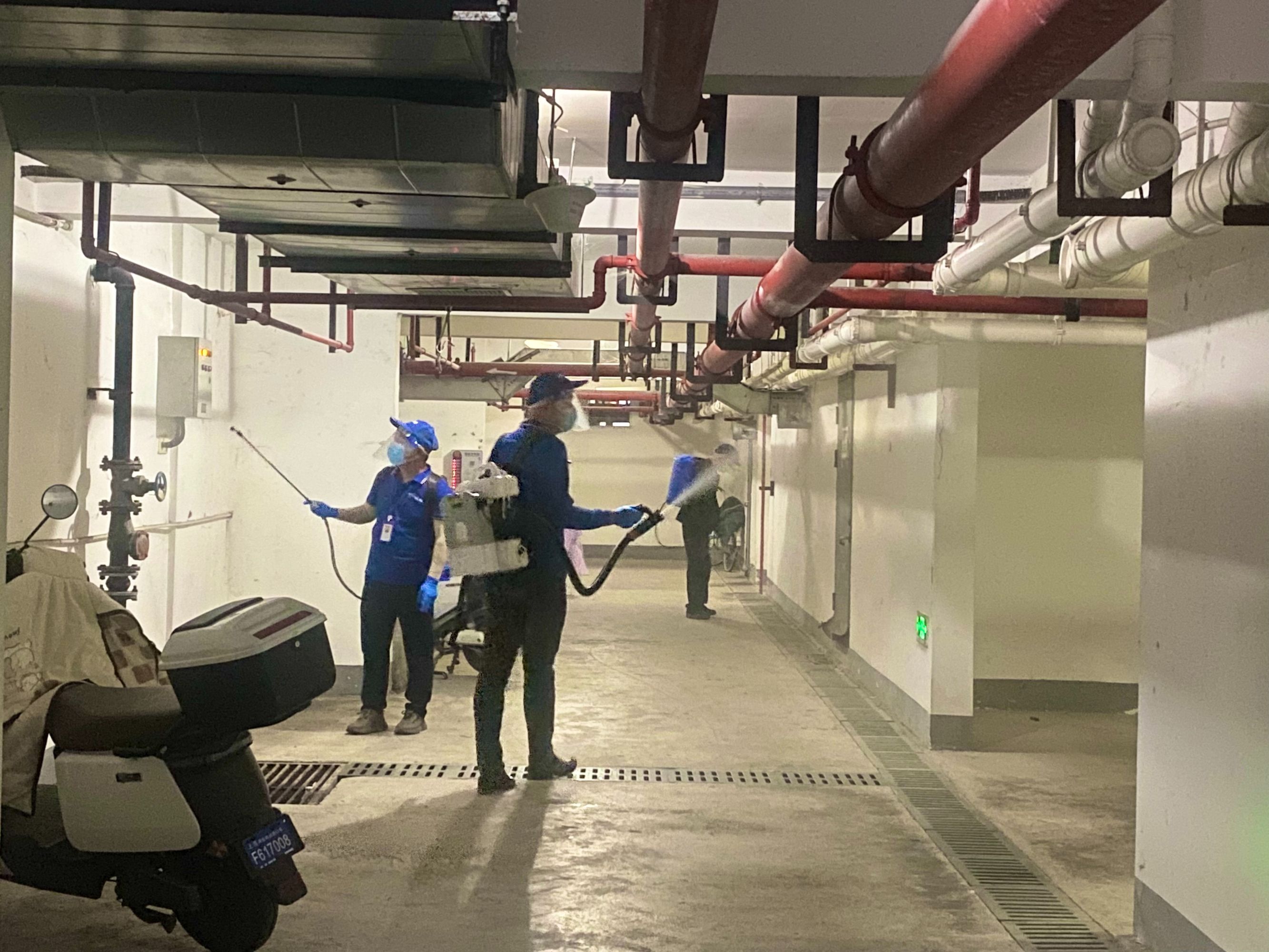 在专业作业区,PCO专业防制人员正对地下车库墙面进行滞留喷洒,并向集水井投放灭蚊幼药剂;针对楼道、垃圾厢房等重点区域,也同步开展了消杀作业与防制设施维护工作,全方位降低病媒生物孳生风险。