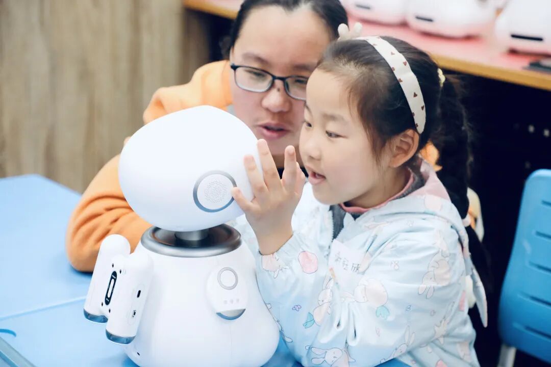 孩子们在AI体验课中与“小飞”机器人亲密互动