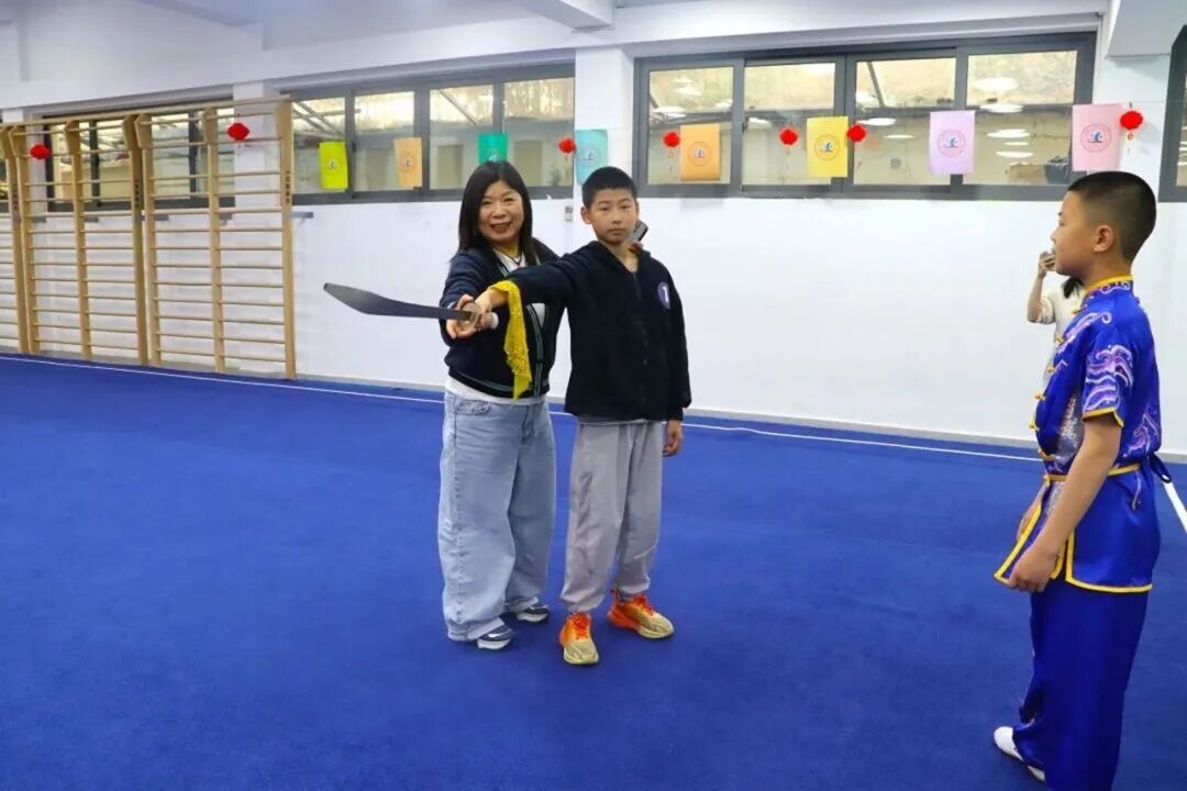 体操房内,“世界瑰宝——中华武术”课程魅力十足。激昂的音乐中,储能中学武术队成员的精彩表演录像和现场展示吸引了众多小武术迷。在体育老师和武术队员的指导下,孩子们认真学习基本动作,还勇敢上台互动展示,现场气氛热烈非凡。
