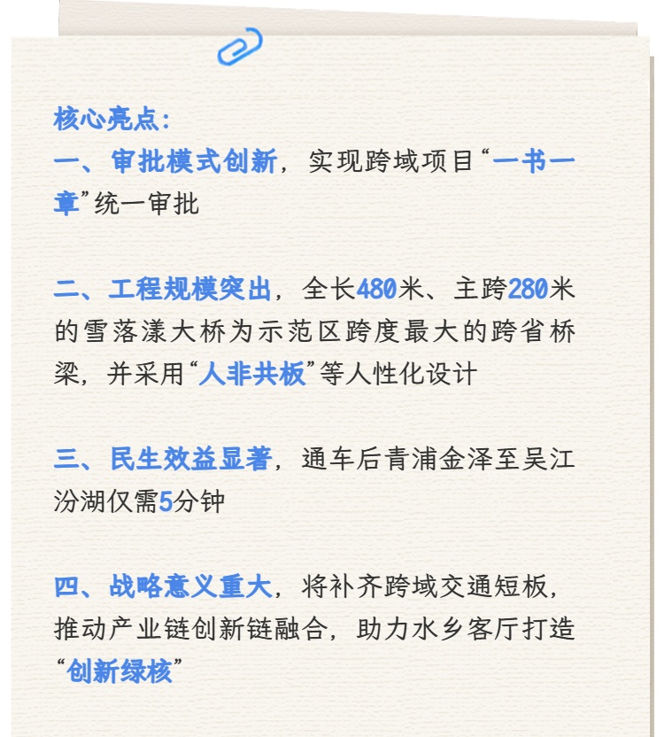 从空中俯瞰,全长480米的雪落漾大桥横跨沪苏省界,9跨上承式拱桥造型流畅,主桥全长280米,是目前示范区跨度最大的跨省桥梁,与周边江南圩田、桑基鱼塘景观相映成趣,成为水乡客厅新地标。