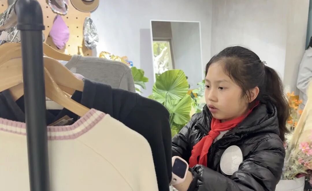 4月12日,在金零路127号的善淘Buy42石化街道慈善超市里,小学三年级的学生陈楚瑶正踮着脚尖,将一件衣服仔细套上衣架,挂上货架。这是她作为“一日店长”的第四项任务:整理捐赠品、学习收银、接待顾客。
