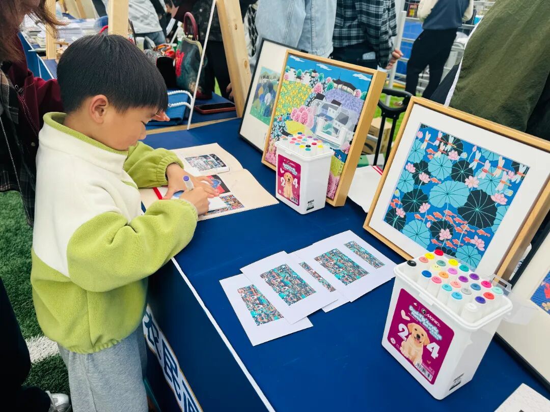 在非遗摊位前,孩子们热情踊跃参与农民画体验。他们拿起画笔,在帆布收纳袋上,充分发挥想象力,绘画出片片荷叶和活灵活现的鱼儿。一位小朋友兴奋地告诉记者:“我给自己画了一个收纳袋,打算回去放水笔,很好看、也很有趣,而且摊位上还放了很多绘本,我也很喜欢。”