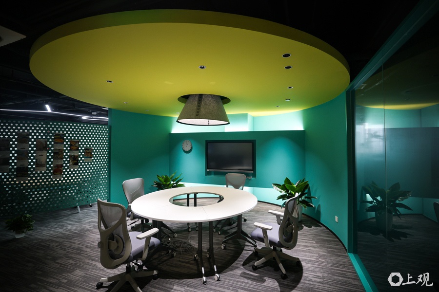 因“古象大楼”地处外滩历史风貌区,黄浦区对其更新选择了“轻量化改造”。在建筑主体结构与外观不改变的前提下,增加了建筑的开放度,在一层打造了通透的入口和商业外摆空间。内部则采用模块化、可拆卸设计实现功能切换:打造了路演、发布中心、混合办公与孵化空间、闭门研讨与艺术展示空间等,精准匹配互联网优质内容创作者与金融科技生态企业的需求。楼内设计风格极其简约,在很多房间顶部还能看到各种管线,而不是像一些高端商务楼那样全部包入装饰中。