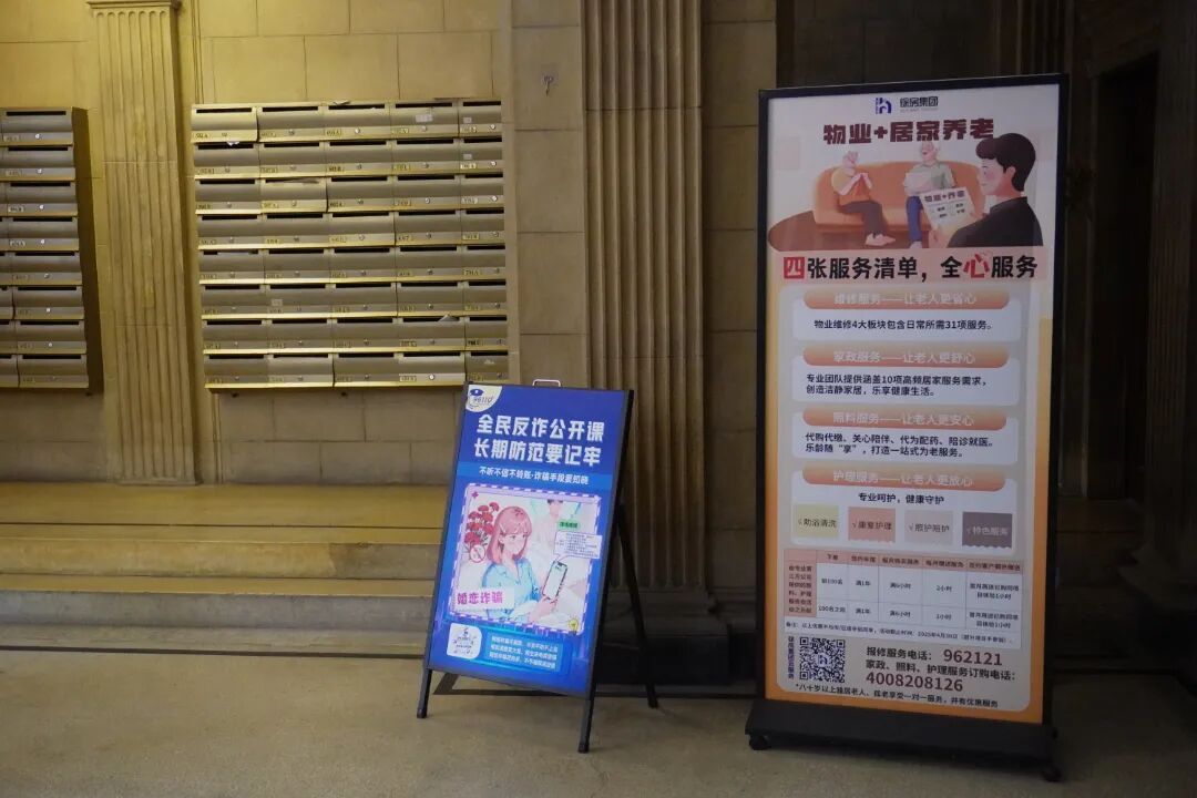 武康大楼一楼大厅内摆放有“物业+居家养老”四张服务清单宣传板