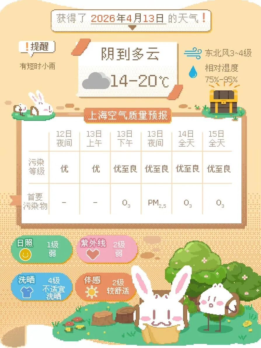 今天(4月13日)阴到多云有短时小雨,东北风3~4级,沿江沿海地区4~5级,最高气温20℃,最低气温15℃。相对湿度95%~75%。