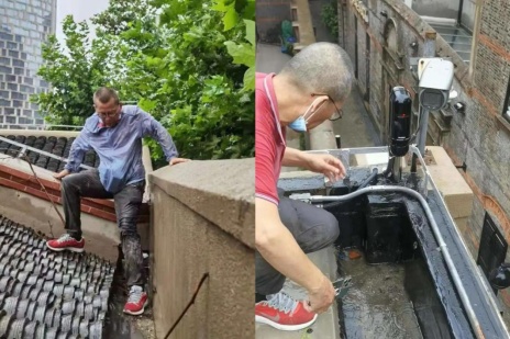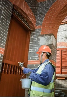 这次修缮是对建筑的防水性能提出了很高的要求,也是一个我们必须要解决的难题。在修缮时,我们是将红砖粉和青砖粉按照固定比例调和,并特别加入了防潮剂、增强剂等现代化学制剂的。由于清水墙外立面并没有全部进行更换,只是针对破损处处进行了修缮,所以修补后墙面还需要涂上一层拼色剂,目的是让新旧砖块的颜色尽量接近,从而不显得突兀。此外,我们还在墙面上涂了憎水剂,这是一种外墙专用的保护剂,具有抗酸碱、耐老化、防潮、防霉等特点。