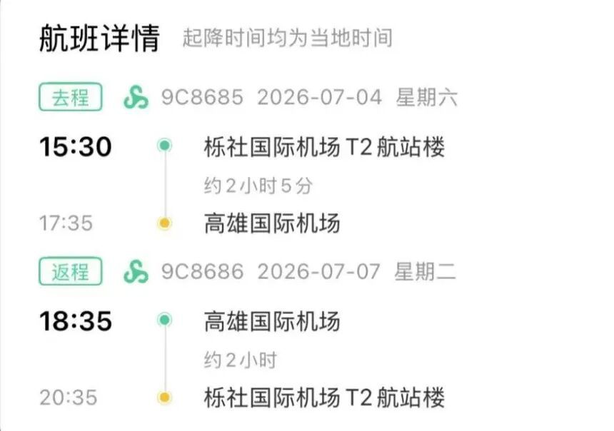 据介绍,即将恢复的宁波往返高雄的航班,每周二、六计划2班,采用空客320机型执飞,周客座数为740座。其中:9C8685航班:15:30从宁波起飞,17:35到达高雄;9C8686航班:18:35从高雄起飞,20:35到达宁波。两地间单程飞行时间约2小时。