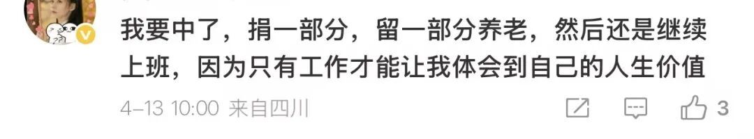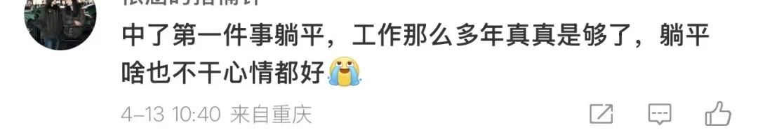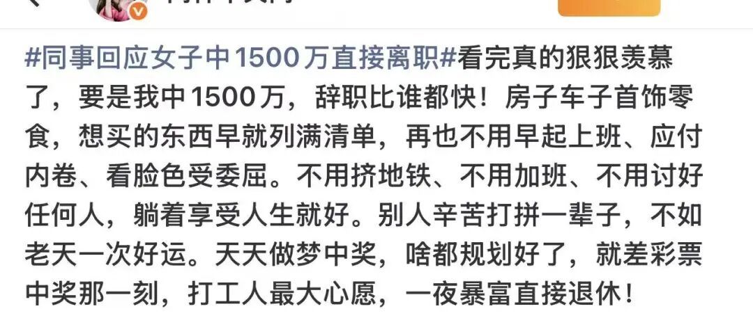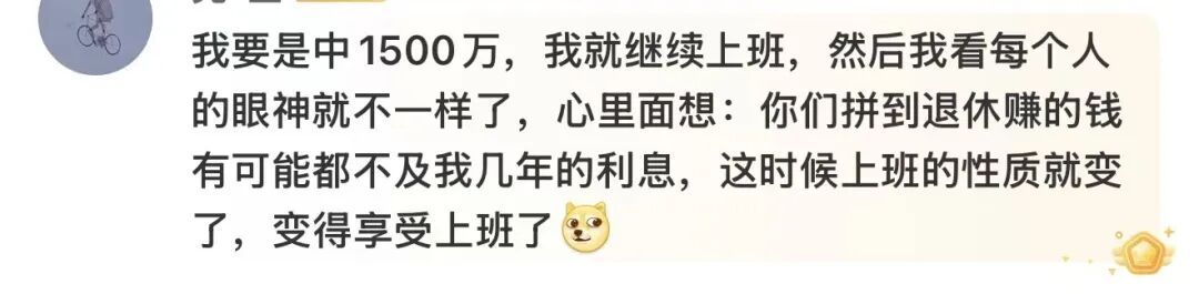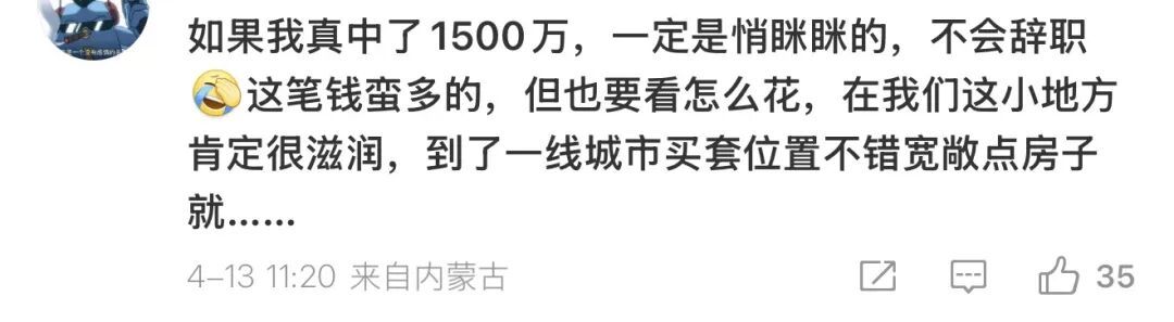 不少网友表达了羡慕之情,甚至代入幻想,规划起中奖后的生活:有人打算立刻辞职躺平、直接退休,也有人表示会换种心态继续工作,轻松上班。