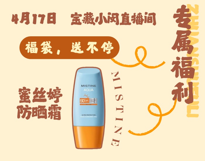 4月17日(本周五)18:00 来自紫燕百味鸡、曼可顿、阿吉豆的 多款好物、专属福利 将亮相“宝藏小闵”直播间! 提前预约 开播第一时间收到提醒! 为了感谢大家 对“宝藏小闵”的期待与支持 我们准备了10份 Mistine蜜丝婷新版 小黄帽面部水感养肤防晒霜乳40mL 免费送!免费送! 原价69元一支的Mistine蜜丝婷防晒,高倍防晒、水感清爽、养肤修护、温和敏肌友好,同时兼顾防水防汗,累计销量破亿支。夏日将至,防晒工作要做好! 还有50份一元秒杀的小闵专属福利,只需花1元钱,就有机会抢到价值23元的金龙鱼精萃稻米油700mL,要拼手速哦,手慢无~ 如何赢好礼 一、关注“宝藏小闵”视频号,点击预约首场直播