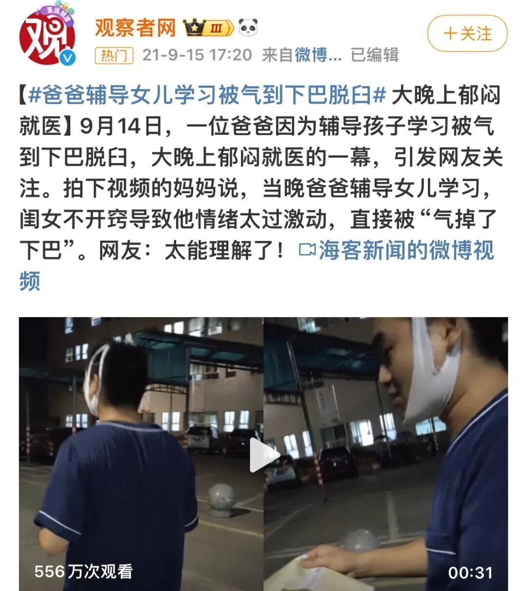 ■2021年9月,湖南岳阳一位爸爸在辅导女儿作业时,情绪激动被气到下巴脱臼。
