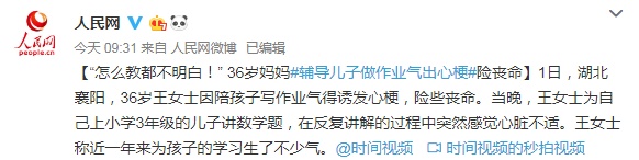 ■2018年,武汉一位42岁妈妈经常辅导孩子写作业,结果气出急性前壁心肌梗死,险丧命。