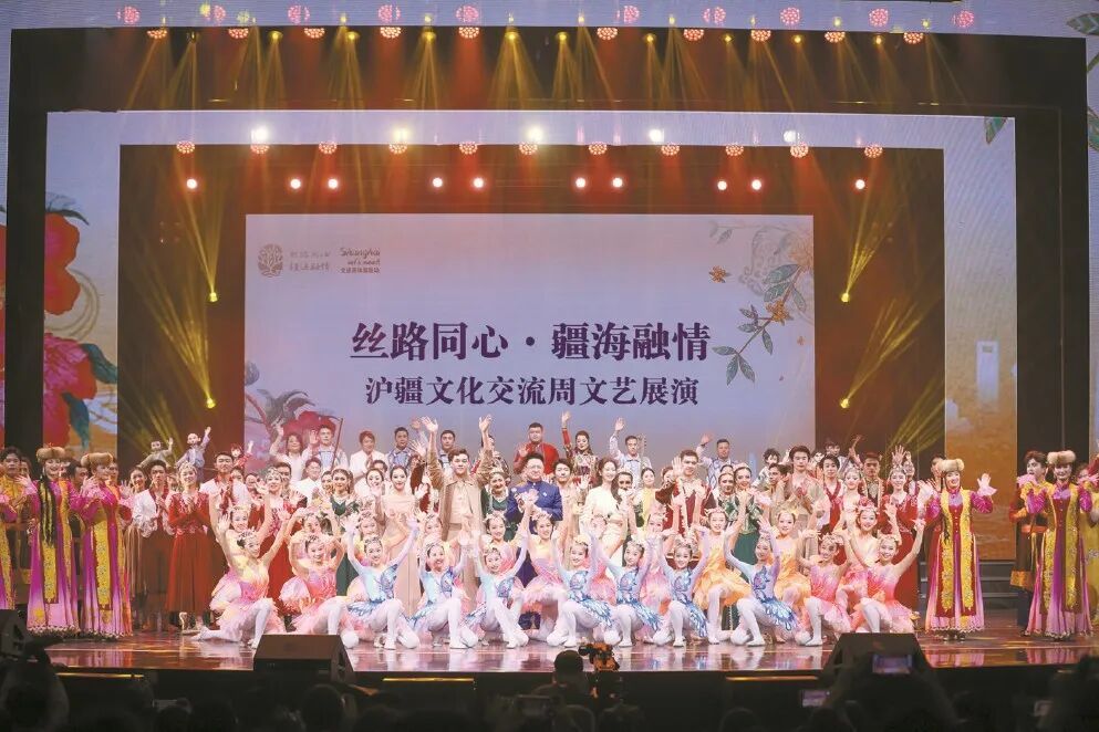 文化交流方面,上海专业院团组成“文艺轻骑兵”,深入喀什城乡社区、医院学校、部队营房,将品牌节目内容送到基层群众身边,累计组织落地活动1600余场次,线下覆盖人数约38万人次。创办喀什上海文化周、星空音乐季和沪疆文化交流周等系列活动,邀请多家单位开展文旅产业对接和文旅商体展联动。联合华谊回力和上大美院,开发艾德莱斯纹饰回力跑鞋“新国潮”,助力艾德莱斯旗袍等产品亮相上海时装周,帮助当地实现非遗活化传承和技艺产业化。