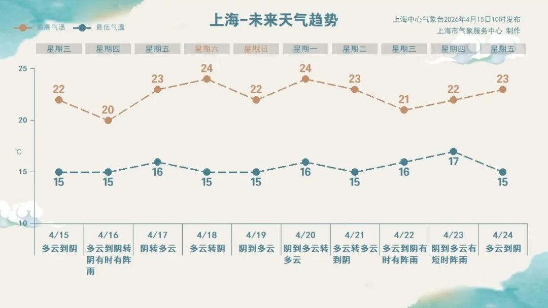 今天(4月15日)本市天气以多云到阴为主,阳光在线,升温明显,早间大部分地区最低气温在13~16℃之间,日最高气温上升至22℃。今天风力不大,中午起转东北风3~4级,相对湿度95%~65%。今夜明晨局部地区仍有可能出现雾,请市民们注意道路交通安全。