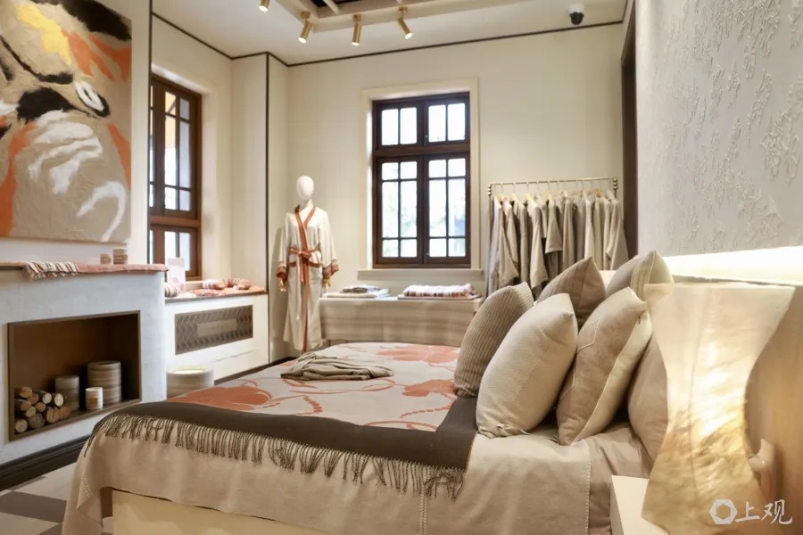 从成衣到家装,这两年,沙涓的定制边界在不断延伸。在沙涓张园全球旗舰店的二楼,布设了羊绒家居展示厅:羊绒床品、窗帘、抱枕、沙发,甚至柜子、墙纸、壁画都可以制成羊绒材质。消费者看中产品,可直接在这里定制下单。曹心田指着挂在墙上的一张羊绒壁画说,这是店内的爆款,很多消费者觉得将羊绒壁画挂在家中很特别。每张壁画的图案、纹理都是独一无二的。