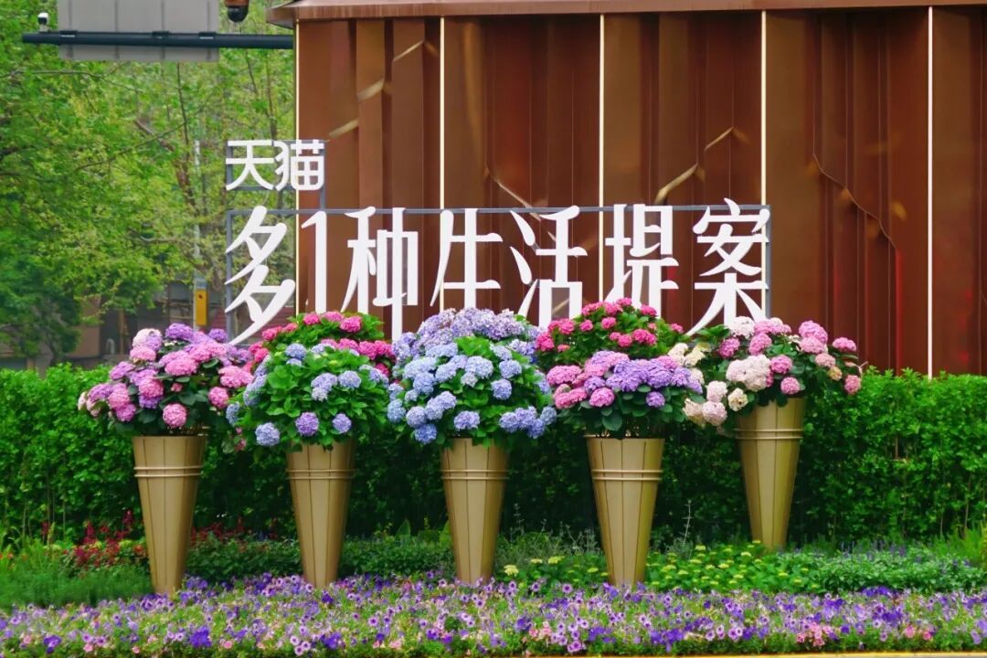 一组高低错落的花簇,九组花束与花球如微缩的山丘起伏绵延,与相邻的花束绿雕遥相对望。元宝形态的花境温柔围合,将“汇聚成景、生息相映”的意象层层晕染,为“繁花静安”增添灵动韵律,也让街角邂逅有了最温暖的注脚。