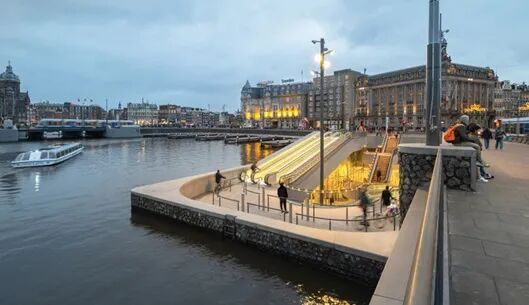 阿姆斯特丹Stationsplein水下自行车停车场是这座城市中最大的自行车停车场,可容纳约7000辆自行车。停车场建在中央火车站站前广场的运河下,低于水平面9米,通过三条自动化步道与地面连接,其中一个出入口就紧邻恋人运河游船码头。车库入口有大面积的玻璃幕墙,可以引入自然光线改善地下空间的采光,内部以白色等明亮色调为主,充满现代感并直连火车站大厅,实现自行车与火车的无缝衔接。类似的标志性车库,既能解决自行车停放问题,大大提升交通效率和城市美观度,也能让人看到,在真金白银的投资带动下,这座以运河起家的城市仍在不断发展进化。