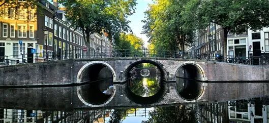 船过桥下,导览也少不了讲讲桥的故事。行至修士运河(Reguliersgracht)与绅士运河交汇处时,提醒游客不要错过拍摄7个连续桥洞的最佳机位。然而,机会稍纵即逝,我并没有抓拍到这一美景。第二天清晨跑步时,我在莱顿运河(Leidsegracht)与绅士运河交汇处拍到了类似的多桥连景,具体有几个桥洞不得而知,但这番无人的美景和韵味也算是被我记下了。
