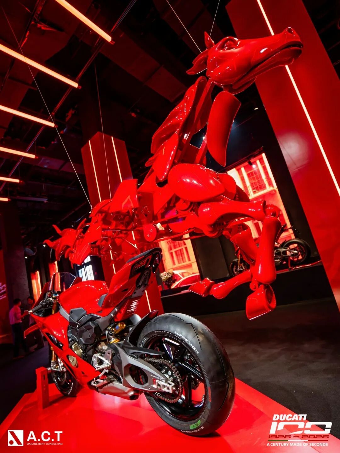 重点来了!空间最核心的打卡点,一定要冲!东方风的赤马雕塑,和Ducati Panigale V4机车面对面呼应,赤马奔腾的样子,刚好贴合2026赤马之年,再配上标志性的杜卡迪红,东西方美学撞在一起,随便拍两张都能刷爆朋友圈。