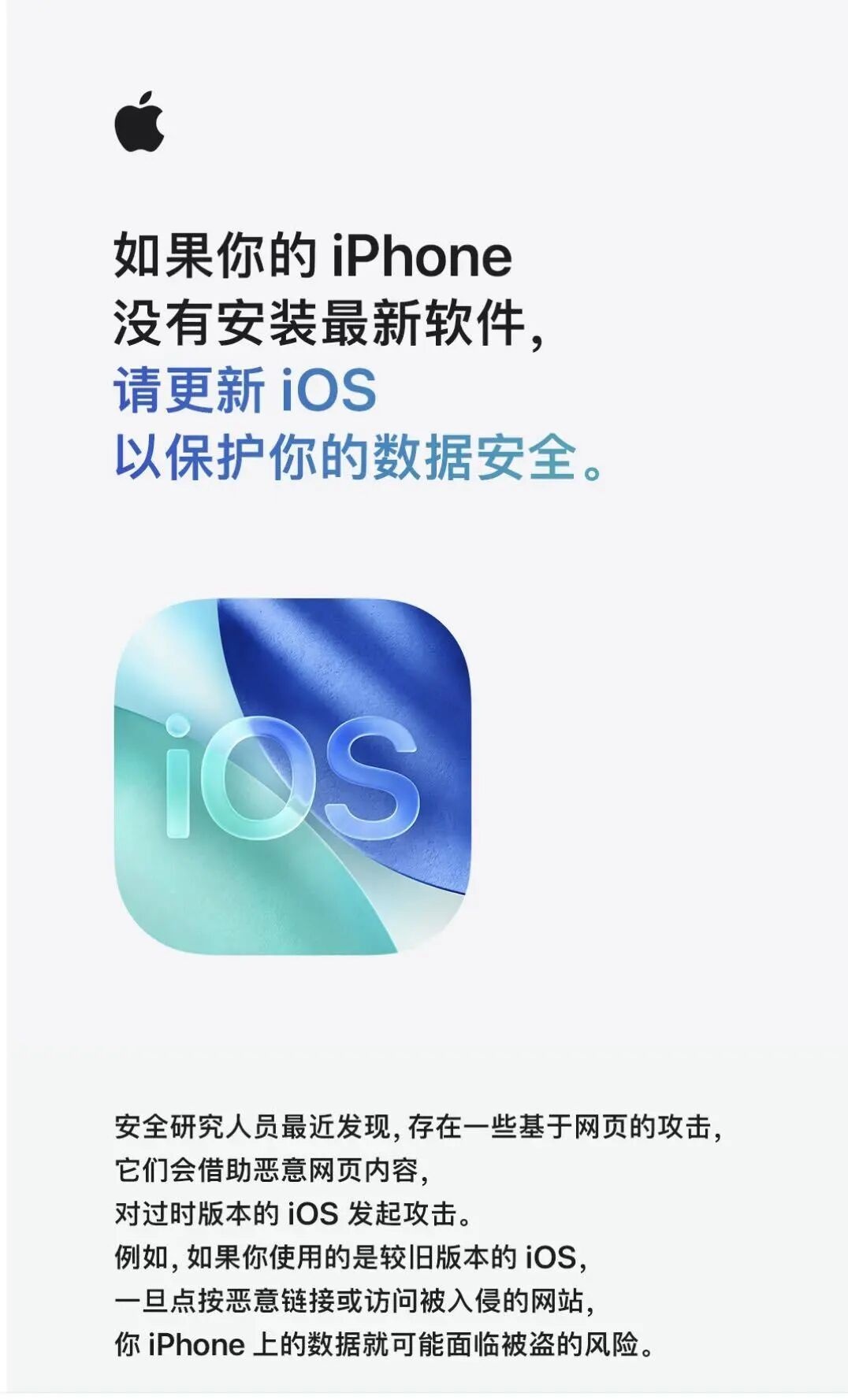 苹果官方回应称,发现后已第一时间针对最新操作系统版本发布软件更新,阻断攻击。同时,全国范围内Apple Store零售店、授权经销商及服务商为有需要的用户提供软件检测与更新服务。苹果提醒用户,保持iOS最新是保护数据安全的关键,建议开启系统自动更新,不点击陌生短信链接,软件尽量通过App Store下载,如有升级问题可联系官方支持。